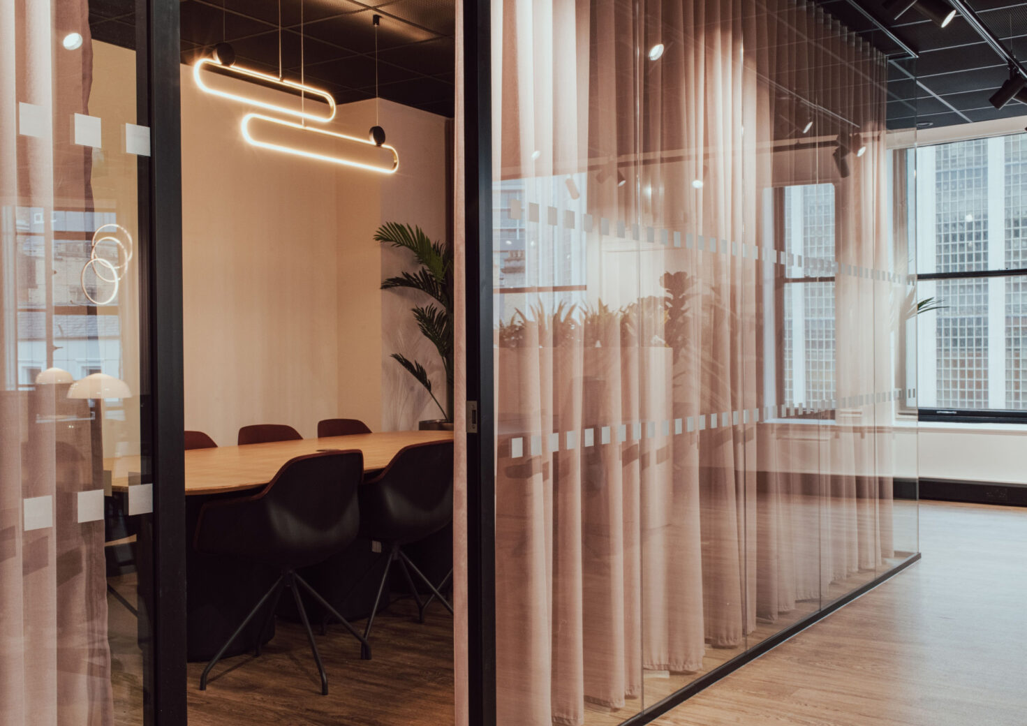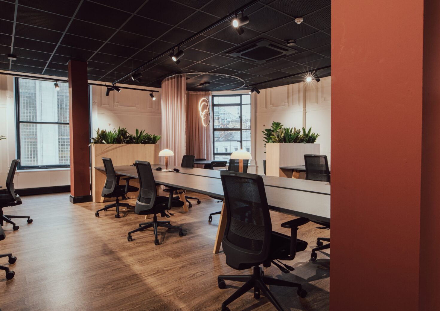 SCENE’s design for 1 King St. was inspired by Silicon Valley in the San Francisco Bay Area of California, which has the largest concentration of high-tech companies in the US and is synonymous with innovation, disruption, fast-growth and entrepreneurship – the perfect inspiration for ambitious Manchester business leaders. The Californian aesthetic u2013 with a colour palette of burnt oranges, sunset reds, honey oranges and pale woods u2013 creates an exciting, vibrant backdrop for our office space. Feature 3D wall coverings add further depth and character, while prominent planting displays promote health and well-being throughout.