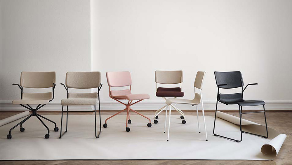 With 18 different versions, the chair is practical yet customisable. Interior-wise designers can opt for a range of aesthetics including: seat and back in natural or black recycled plastic with hemp; frame with runners; and legs or casters in black/white-lacquered metal. The D2 chair can also be semi or fully upholstered, in contrasting colours, and purchased with or without armrests.