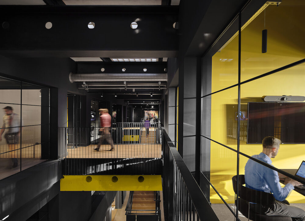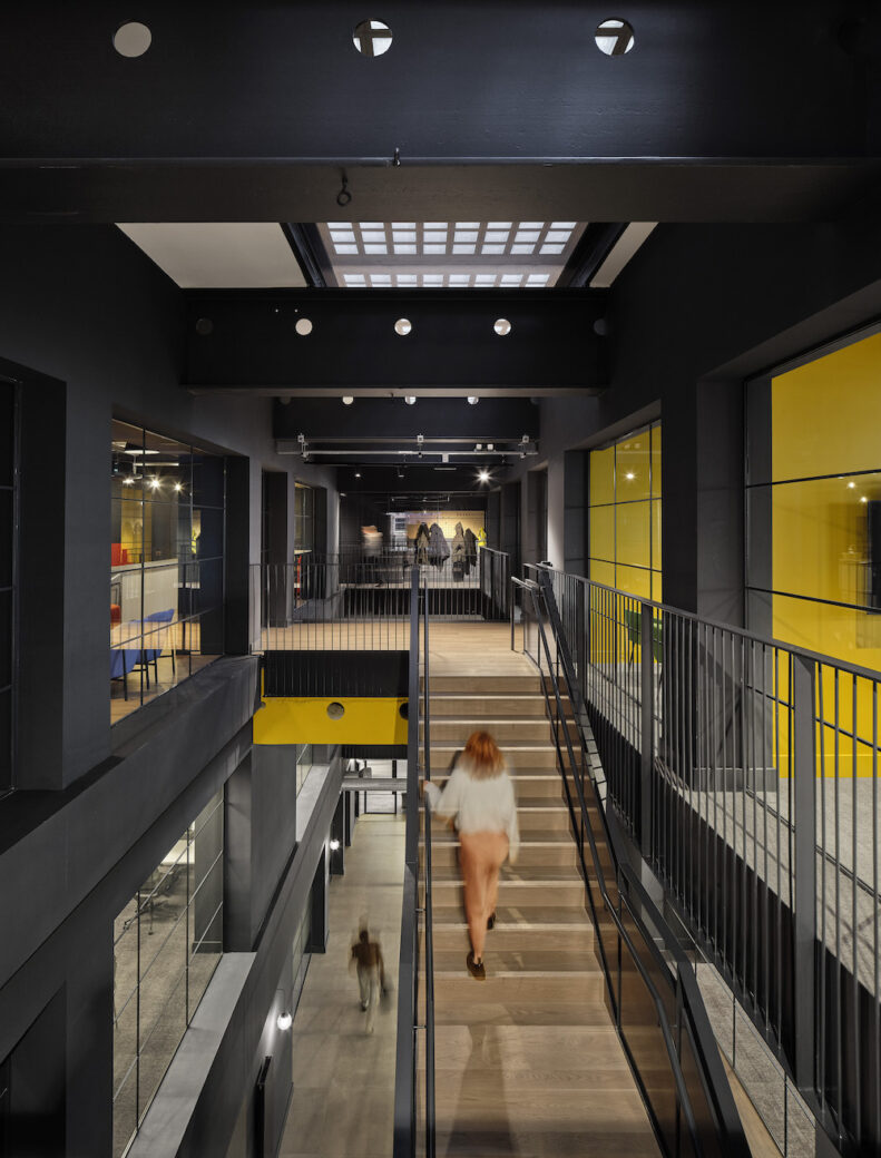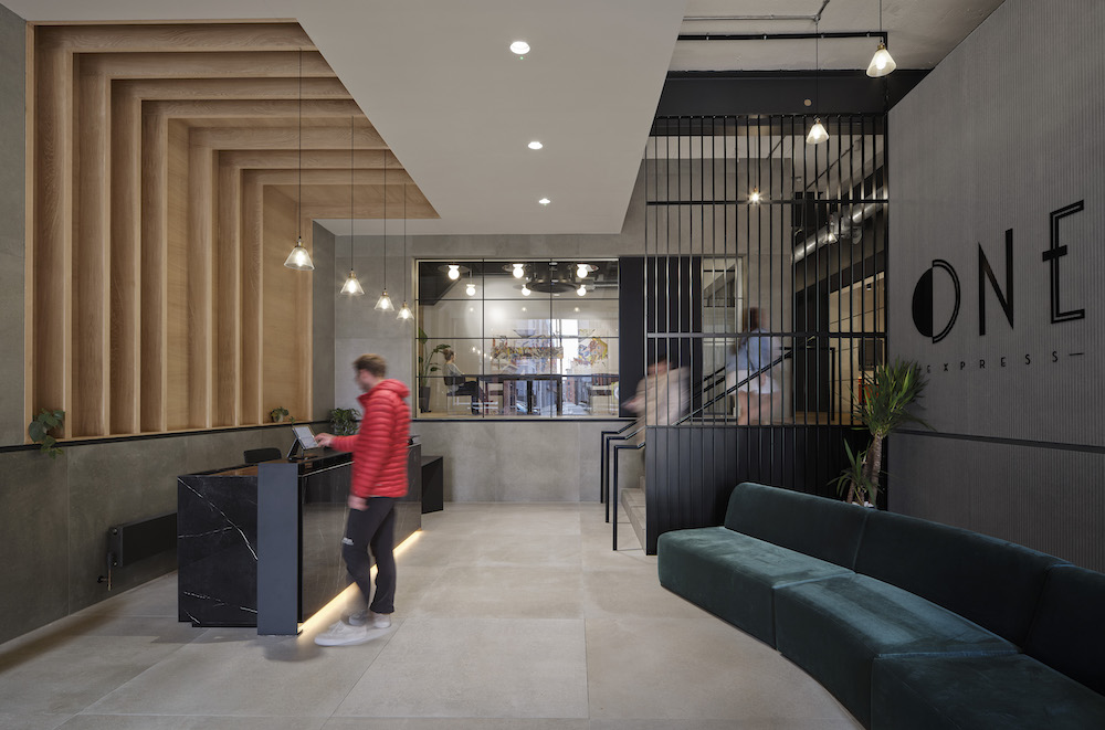 ONE EXPRESS is a Grade II* listed building designed by Sir Evan Owen Williams at the heart of Ancoats. A full refurbishment involved the careful exposure of all of the original huge structural frame, floors and ceiling soffits of the buildings interiors, and celebrating those features with new modernist fabric interventions. The new and old fabric parts are clearly and deliberately defined. Located in the basement is a fully subscribed gym for both tenant and public use. At ground floor a new reception, café, varying size office units and communal break out area and kitchen. Varying suite size offices are located at first and second floors all with an integral meeting room and kitchen. Uniting these spaces is a metal plate feature stair cantilevering into the central lightwell. Four existing monumental columns and cross beams dominate the floor plates and have been painted to their original ochre yellow colour.