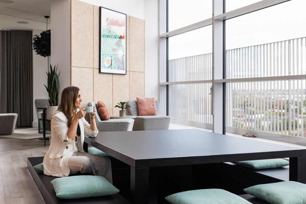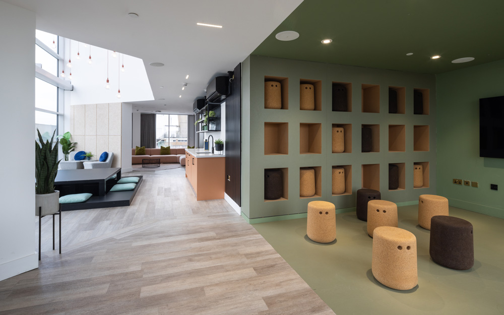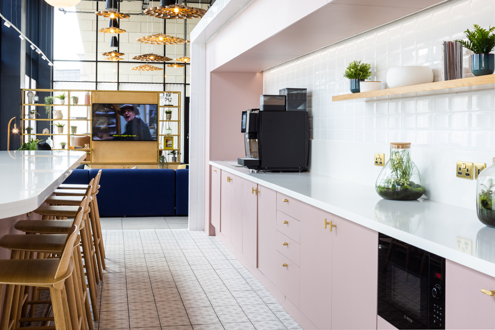 Utilising a new hospitality concept, Bridle Works offers a variation of settings to meet the ranging needs of its tenants. Meeting rooms, study spaces, and a ‘grab-and-go’ breakfast bar in the reception area provide convenience for users throughout the week. Other spaces are solely geared towards recreation, including a ‘glam’ room for the fun of getting ready to dress up and go out, a ‘dual gaming’ room, a roof terrace equipped with barbeques, and a double-height ‘tea lounge’, complete with sunken table and panoramic views of the city.