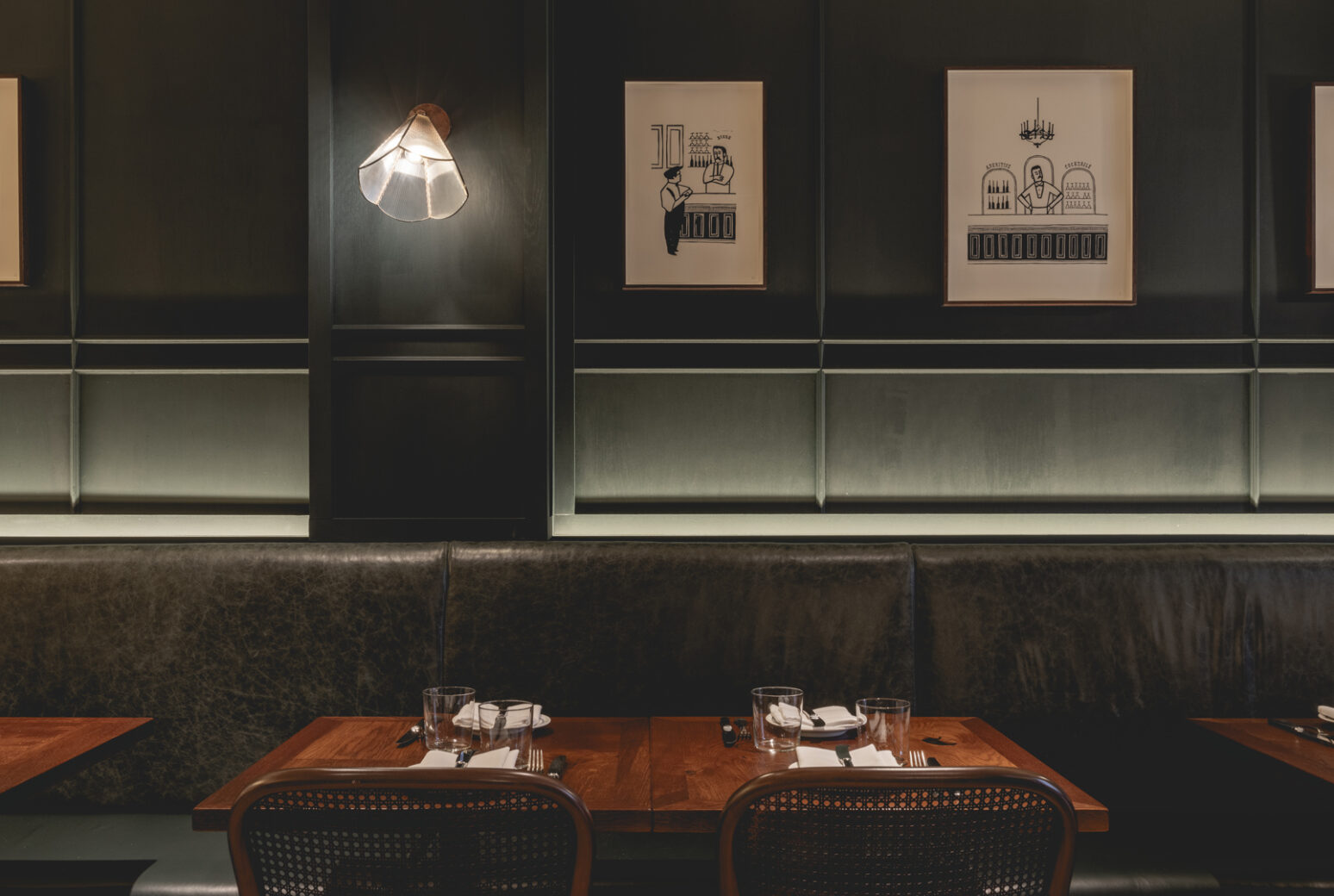 Its deep green shop front evokes British countryside meets Parisian bistro, while inside the restaurant is both luxurious and timeless with rustic touches taking its cues from head chef, Stuart Andrew, and his culinary inspirations from time spent in Paris. Through considered choice of materials from ‘farmhouse-style’ features such as combination brick and rough timber flooring and sawn timber planks for dining tables, to classic finishes such as aged brass and marble, this is the most design-focused of all Woodhead’s restaurants.