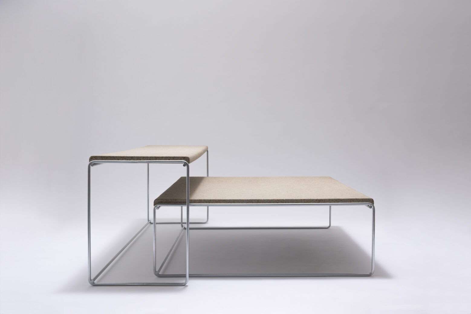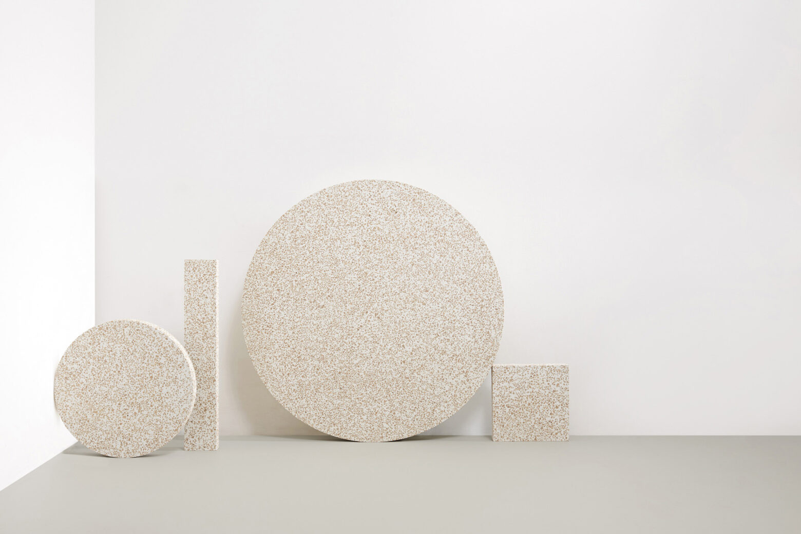 Originating from attempts to make concrete lighter, Corcrete is the result of Studio Niruk’s material experimentation. Using a special production process in partnership with Belgian manufacturers Hartis, the material is crafted from a mix of cement, cork and sand, and can be used in various applications, from coverings, surfaces and furniture. Compared to conventional concrete materials Corcrete is around 40% lighter, thanks to the addition of excess cork granulate from Portuguese cork production, and uses much less sand in the production process – an increasingly scarce resource.