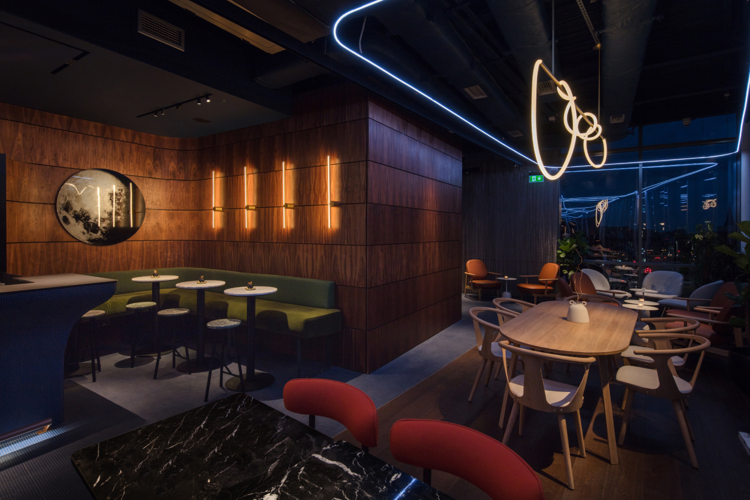 M’Arks Sky Bar is a lounge, bar, roof-terrace and co-workplace in southeast suburban London, cantilevered over the high street. It is designed as a place to share, have coffee and catch-up and work from during the day. Yet as dusk sets in, it becomes ‘rich & dark’ giving way to intimate settings for partying. A melting pot for locals looking to escape the monotony of the high street.