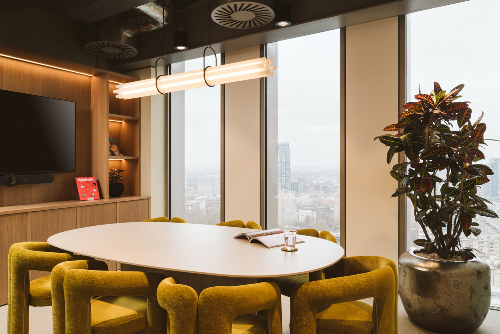 Blockspace’s vision for their office space was a designer’s dream, blending excellent design taste, a diverse artwork collection and a desire for a space that is both inspirational and aspirational. Located on the 24th floor of the Hylo building near Old Street, the office boasts panoramic views of London’s skyline. The design creates a u201824-hour space’ that changes throughout the day, with the layout favouring how Blockspace works rather than traditional desks. Bold furniture and material choices, including contrasting colours and textures, embody the company’s brand values, resulting in a dynamic and eye-catching workspace.
