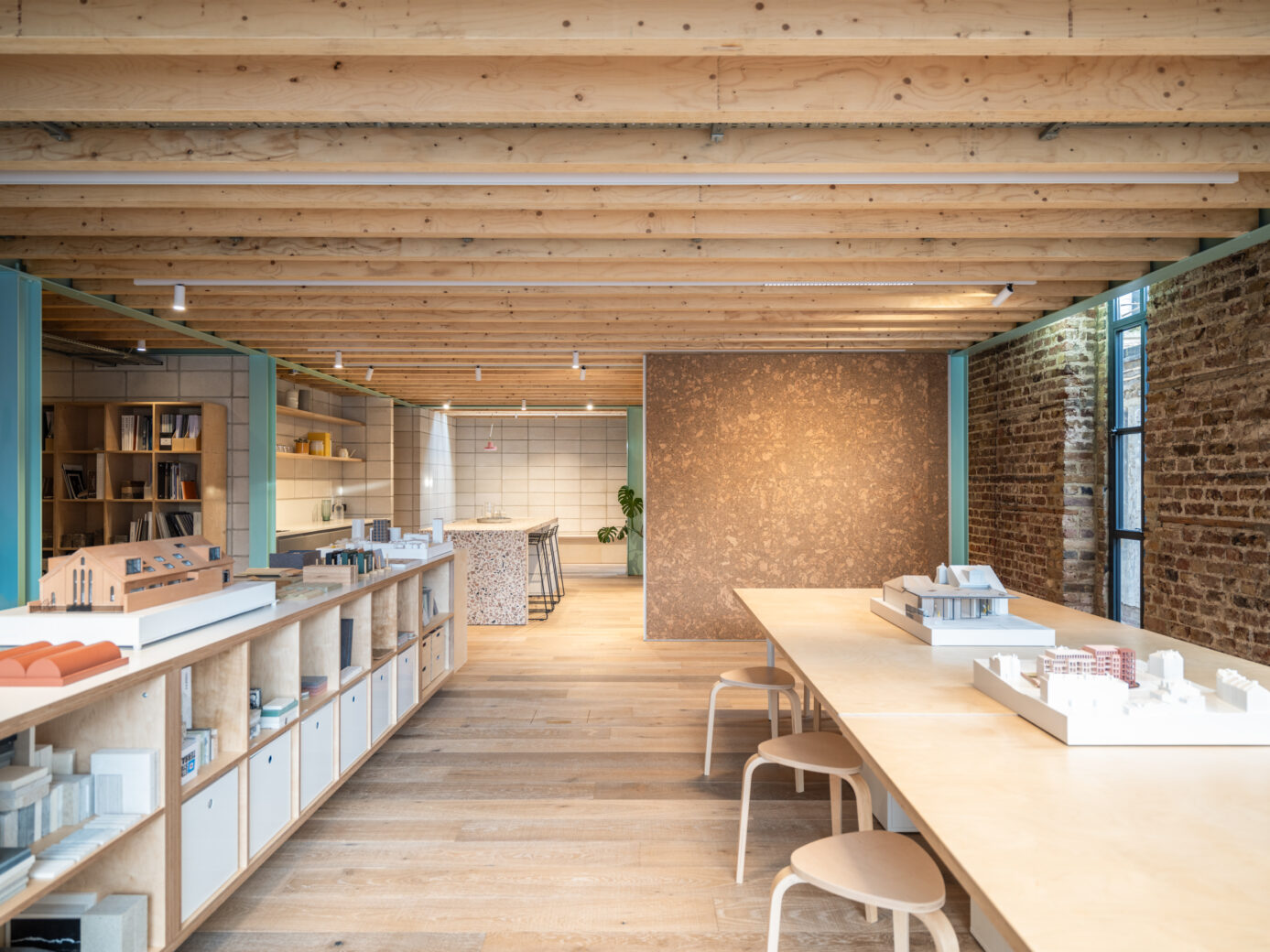 A largely uninterrupted ground floor is strategically subdivided by two permanent features – a cork presentation board and a large kitchen island. This defines diverse workspaces on the ground floor of varying privacy, size and function. Open floor plates encourage flexibility, while selective fixed elements subtly divide the studio into zones of varying size, privacy and functionality. This adaptability also leaves room for expansion, giving the studio longevity. Large windows and dormers flood the space with light while a flexible lighting design adapts to various activities below. The renovation results in a charming, communal design space, welcoming creativity and innovation in a space that’s both historic and contemporary.