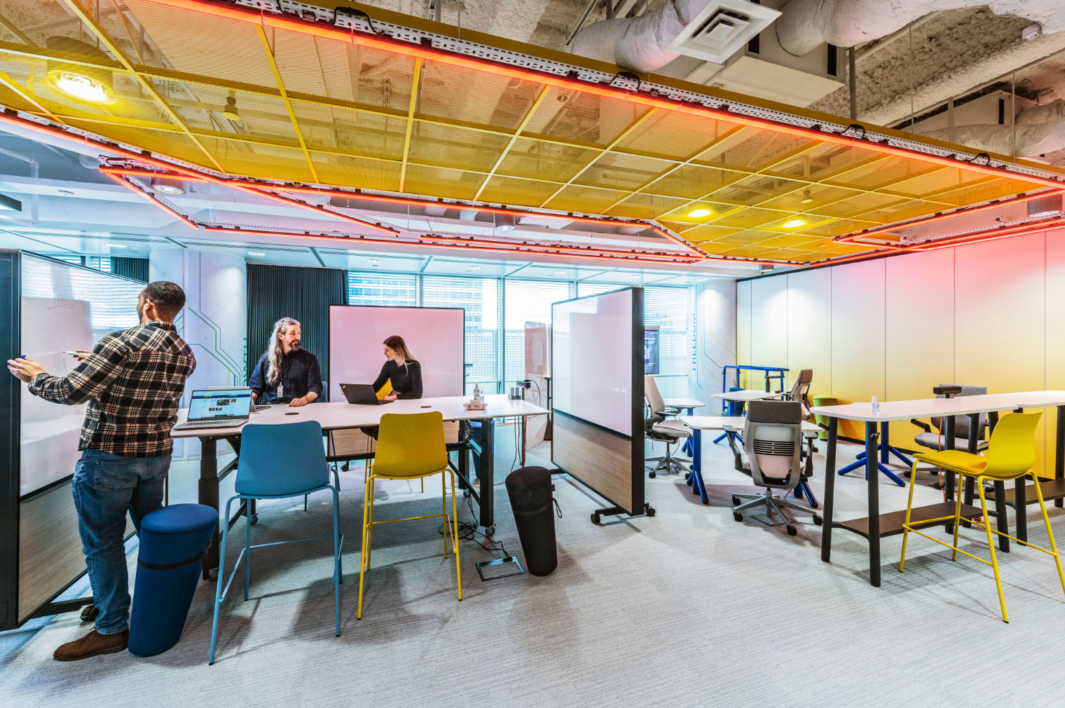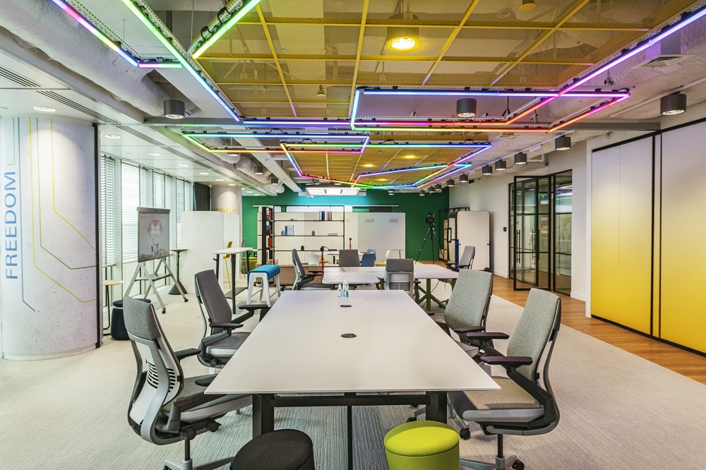 tp bennett created 3 zones in one space, dedicated VC anchor each end with then a central flex zone that can be fully reconfigured, adapted to suit the different teams sizes and activities. The look and feel journey started with 3 words, Energy, Growth and Freedom. Craving to be different to any other space in the 8 Canada Square, the desired look and feel direction was for a lighter, brighter, refined industrial and urban feel.