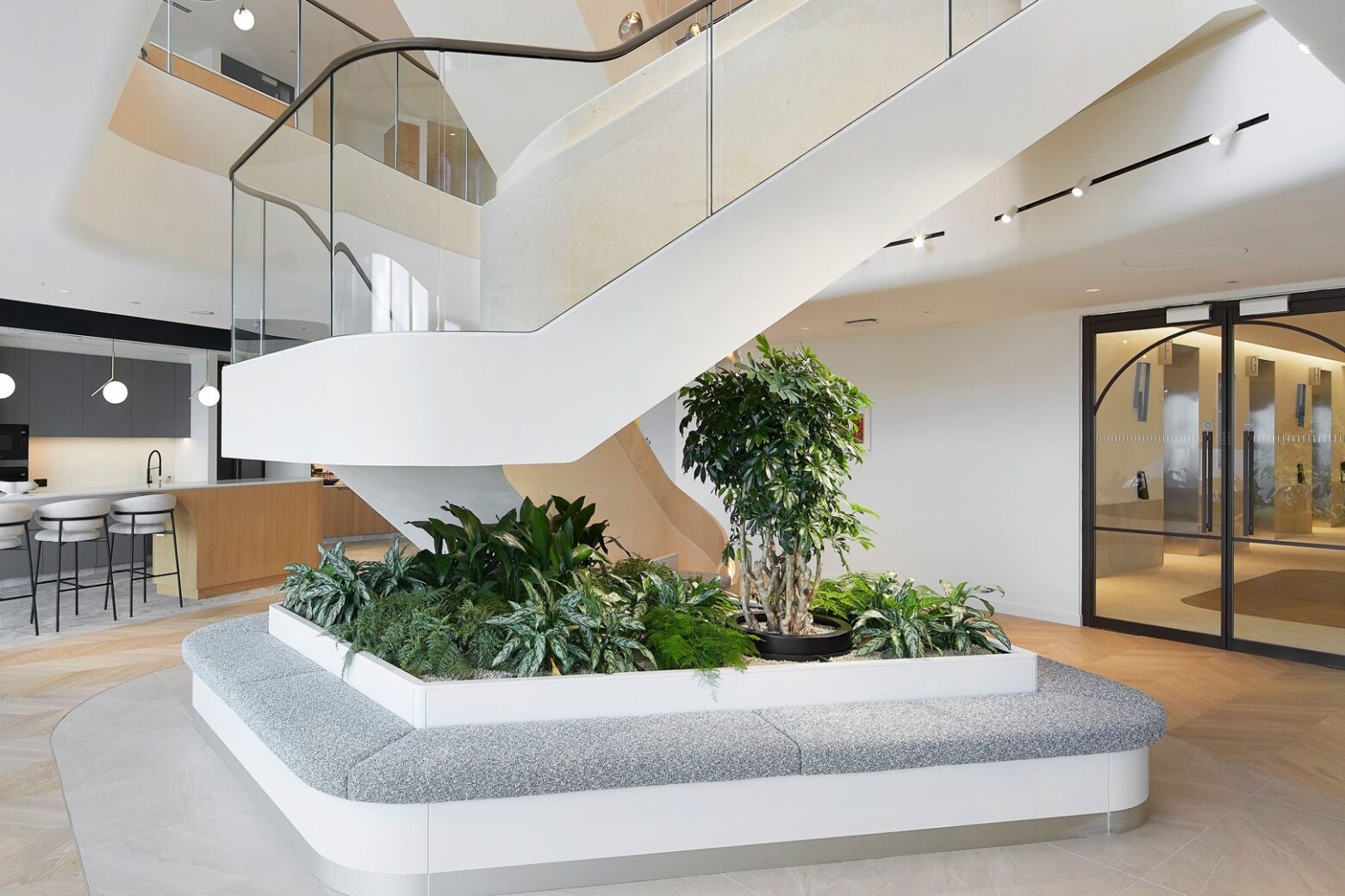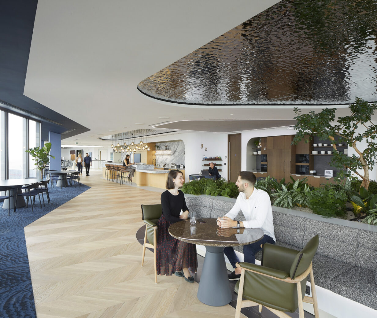 Key to this has been creating spaces that influence people’s behaviour to bring them together and encourage cross collaboration across the business. The scheme delivers beautiful and functional facilities that are future proofed for years to come. Envisioned as a retreat to rejuvenate and socialise in, amenities include a juice bar, snack stations, breakfast and lunch offerings alongside a tech-free sanctuary with yoga studio, retreat rooms and ‘conversation pit’ cocooned by timber-shaded windows in the heart of the city.