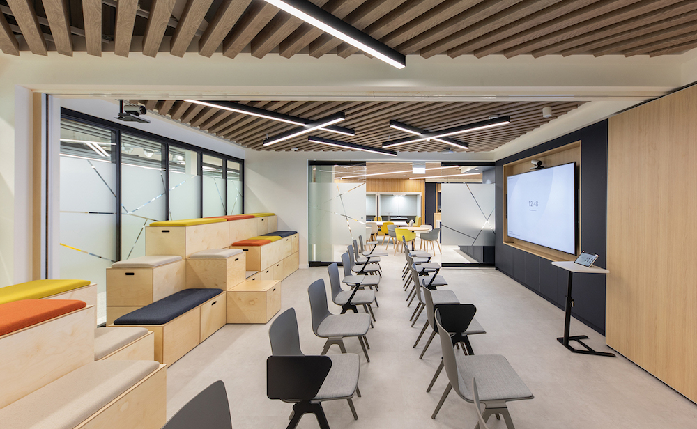 The relocation involved the design of a tailored space, which includes a contemporary reception, client meeting rooms, and a boardroom. A spacious social hub adjoins the reception, with versatile seating and a fully equipped kitchen.