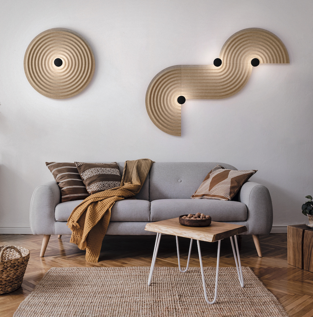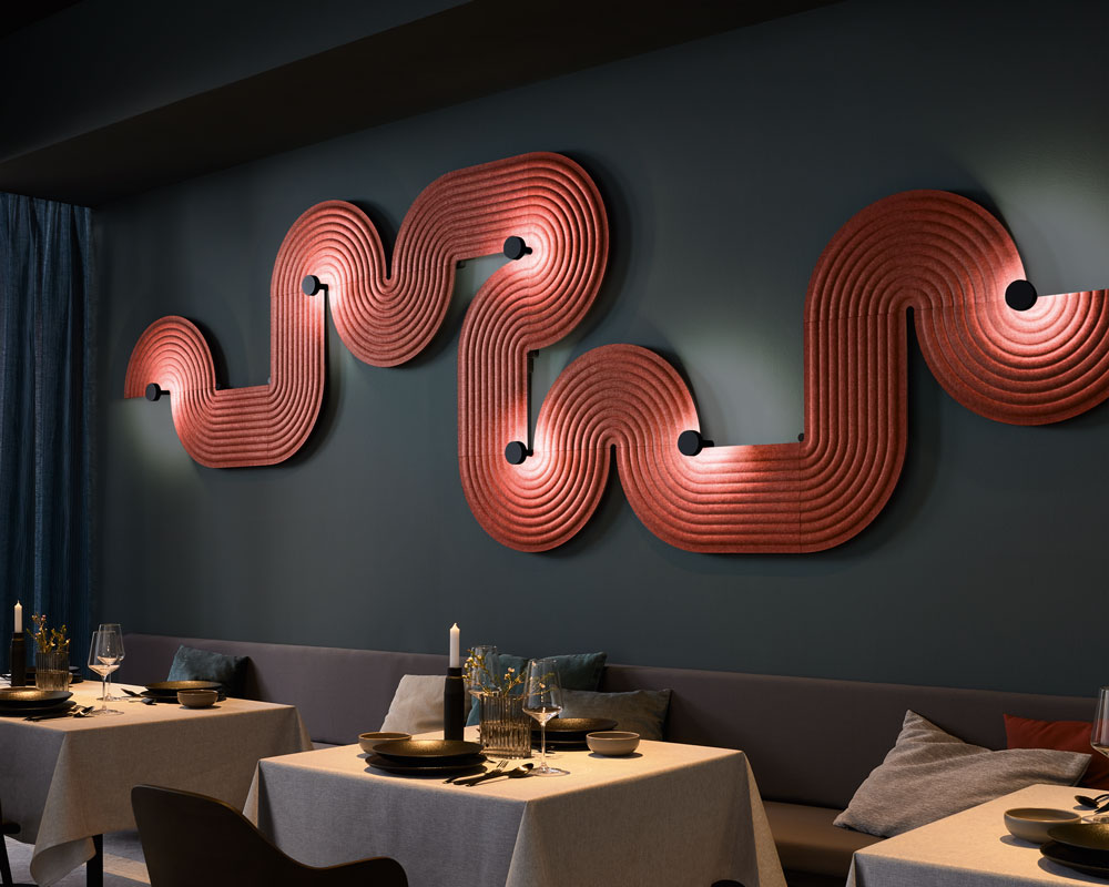 TAPIS SOFT nestles against the wall like a gentle wave and discreetly blends disturbing ambient noise into the background. If desired, TAPIS SOFT, which is available in four shapes and three different colours, can also be positioned as a single light, thus easily creating even more atmosphere. A wall surface luminaire integrated in an acoustic element made of high quality PET felt with sound absorbing properties, TAPIS SOFT is 100% recyclable and its surface felt is available in colours such as: White, Limestone, Marble Grey and Oxide Red.