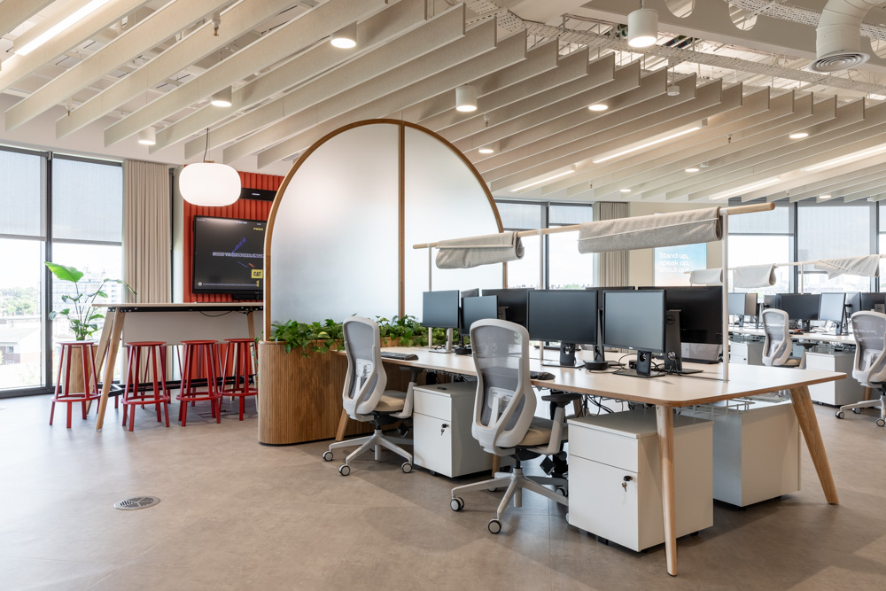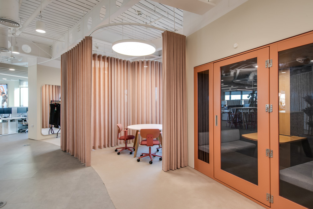 Whiteroom designed Sweaty Betty’s global headquarters to reflect the brand’s ethos of empowerment, collaboration and well-being. The dynamic workspace integrates product development and operations, fostering a creative, unified environment. Featuring zonal planning with creative workshops, breakout areas and multifunctional meeting rooms, the space is designed for flexibility and innovation. A striking curved glass wall brings in natural light, while innovative desk layouts break from conventional office design. Warm tones, soft curves and textured materials create a welcoming atmosphere, supporting both productivity and culture.