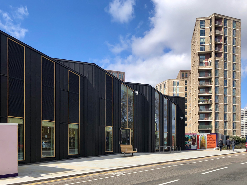 The building’s position, just three metres above the underground tunnels of the Thameslink railway line, created a unique design challenge – meaning the building needed to be designed using lightweight materials and with shallow foundations. The Sports Hall, built by BAM, is primarily constructed using a cross laminated timber (CLT) frame and glulam timber columns, a natural alternative to steel and concrete that is both lightweight and carbon friendly. It is clad in zinc and has a super-lightweight concrete substructure that runs perpendicular to the tunnels to prevent concentrated loads. The serrated roof and façades of the building are a nod to its railway context and heritage.