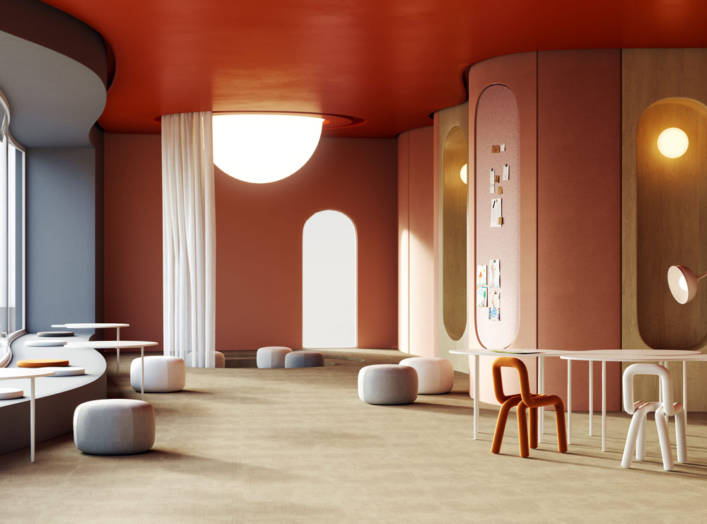 Using modulyss carpet tiles, entrants are tasked with creating a room design that considers acoustics, zoning and flexible furniture to create a sensory space that puts neurodiversity front and centre. The room will be used by all children at the school, from 3-10 years old.