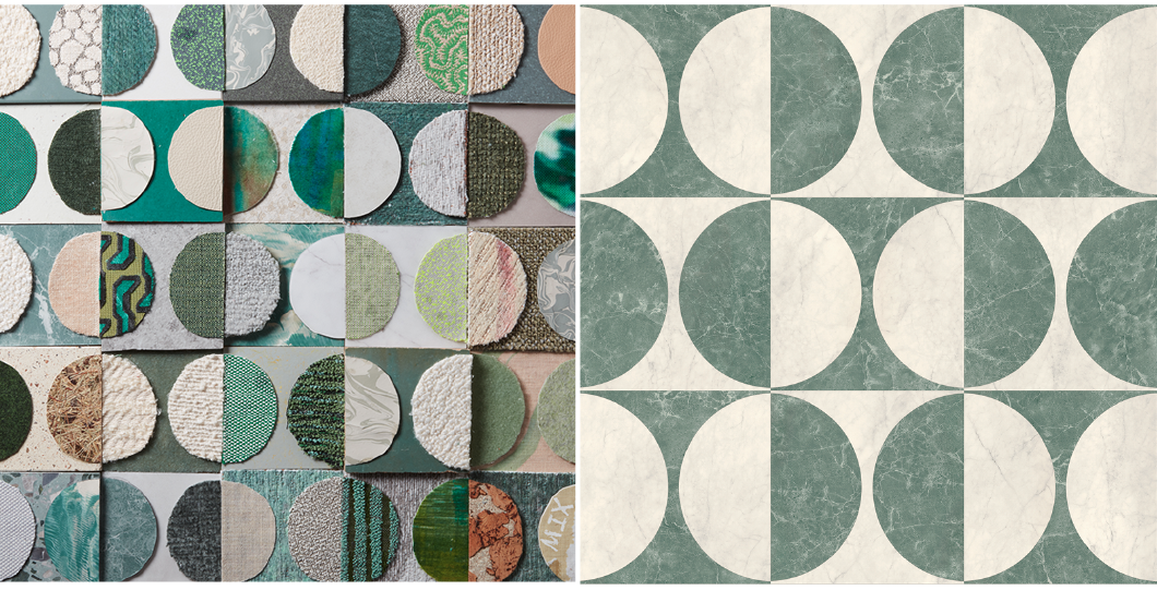 Founded in 2010 by Emma Morley, Trifle* is now a passionate group of interior designers, architects, strategists and consultants who don’t shy away from the bold and colourful. Inspired by the striking geometric design of Lune from Amtico’s new LVT Signature range, the team has reimagined the pattern motif as a mixed media piece of art that imitates a flat-lay – thoughtfully combining Amtico flooring with fabric offcuts and studio surplus to give new life and narrative to otherwise discarded materials; as well as emphasising circularity.