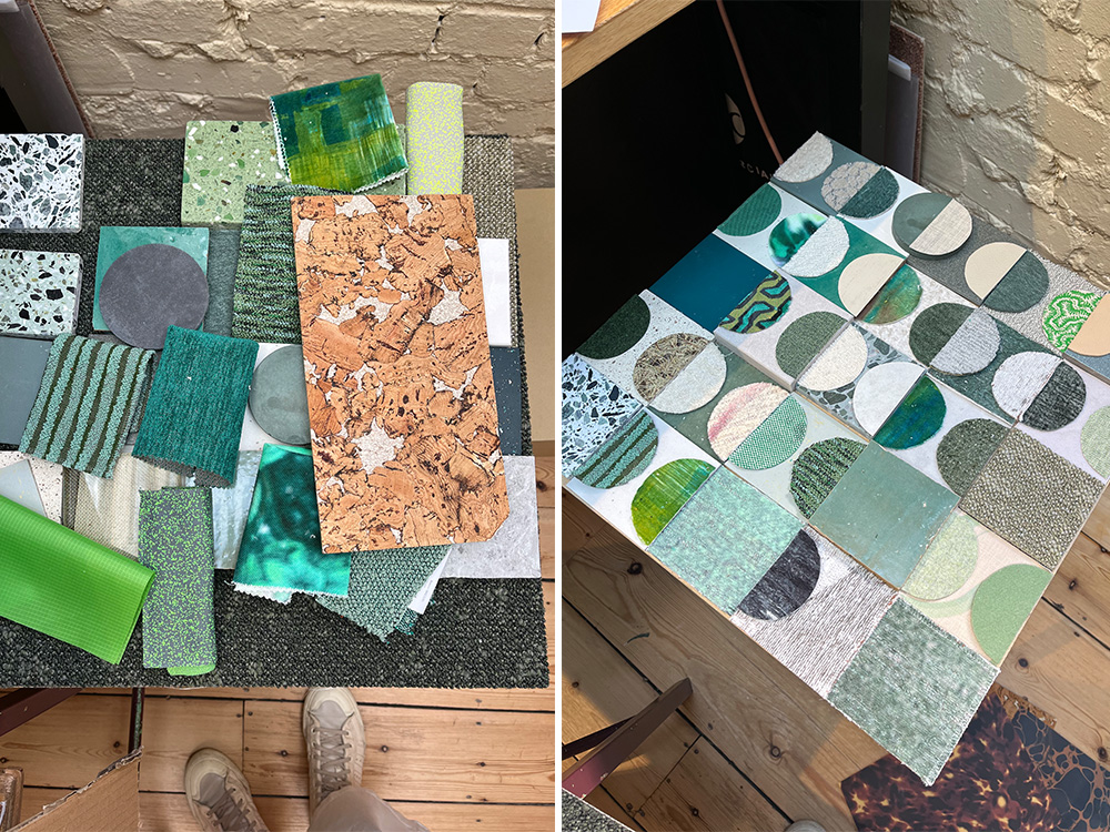 “We loved the classic shapes of Lune’s design from Amtico and were inspired by the brand-new marble palette,“ comments Trifle*’s Nadia Themistocleous. “We stuck loyally to the geometric design from Amtico but ‘mixed’ things up by utilising offcuts from past projects, that were picked because they evoked that sense of marble veining or sought to recreate the marble effect themselves. We were even inspired to create our own ‘marble’ samples from leftover paints – the result a physical piece of mixed media art we will display proudly in our studio.”