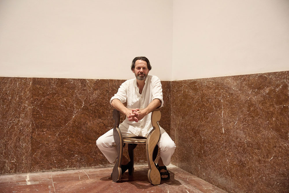 martino gamper sits on his sitzung chair