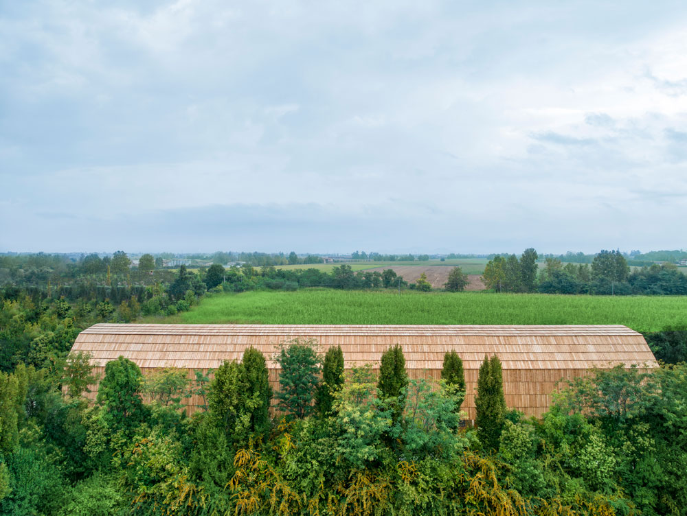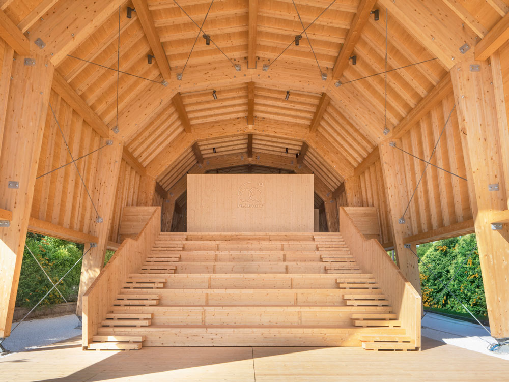 The rectangular Pavilion’s main structure consists of arched portals, connected to one another by horizontal beams, and is crafted in its entirety from PEFC-certified wood. “Wood is the best suited material to express the concept of temporariness in architecture,” says Micheli, “through its transformative process, including oxidation and natural ageing, it develops a character that enriches its emotional value, symbolising the very essence and evolution of life.” Housing two levels for exhibitions and events, a staircase doubles as tiered-seating, leading to the portico at the front – inspired by the loggias of ancient public buildings which were once at the centre of northern Italian towns.