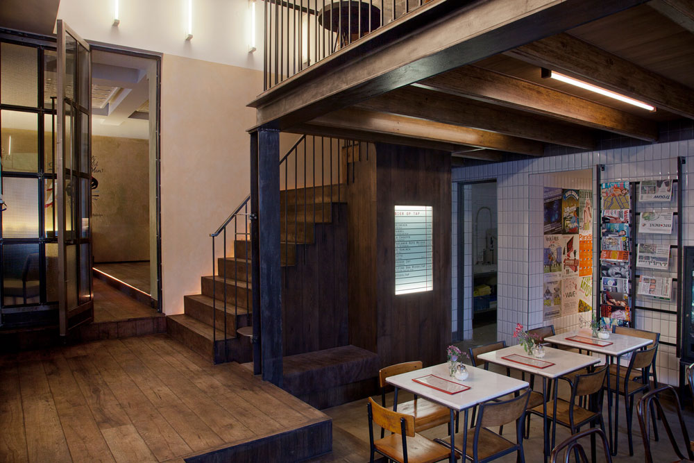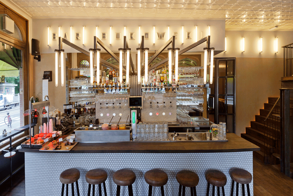 Bar Bukowski is a café and bar in Amsterdam East. The bar’s name refers to the American writer Henry Charles Bukowksi and the interior design of the bar is inspired by his life, taking reference from his love of literature and drinking. Studio Modijefsky was the interior architect, also designing the logos, menu and website.