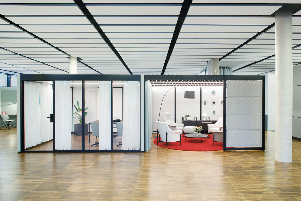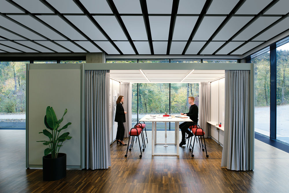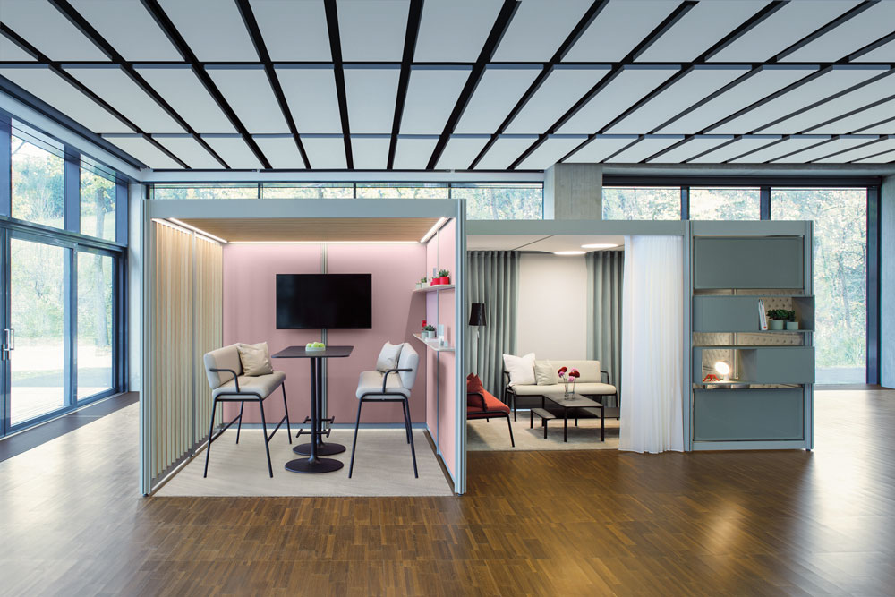 POINTS’ design can be customised thanks to Bene’s range of ‘on- and infills’, which are available in various materials, textures and colours. By combining the modules with suitable lighting options, add-on elements and accessories, users can create the desired ambience for their workplace. Fabrics and curtains (available in a wide range of textures and colours) can lend spaces a feeling of comfort, while melamine or veneer shelves provide structure to open up rooms and offer practical storage space.