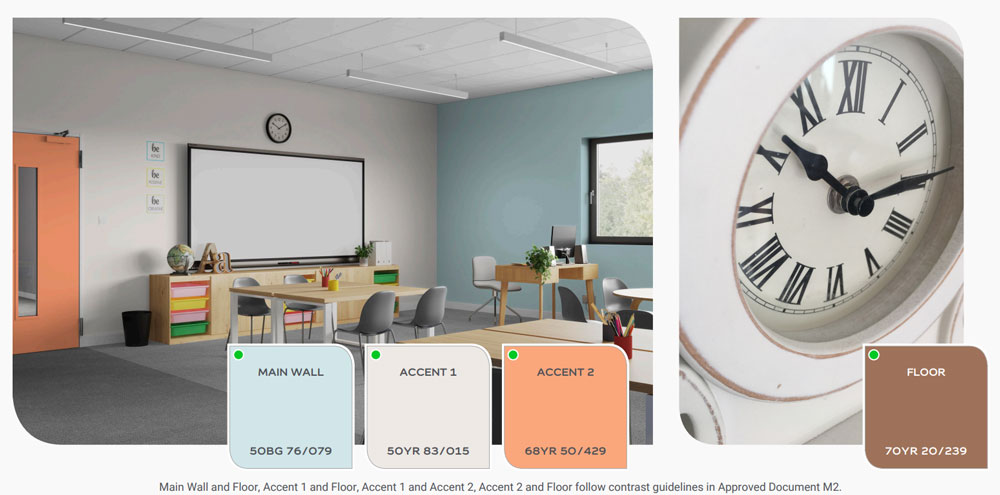 Dulux Trade’s Colour and Contrast Design Guide is a digital tool that helps specifiers create inclusive and functional spaces. It ensures that designs comply with visual contrast guidelines set out in the Building Regulations Approved Document M vol.2, and British Code of Practice: BS8300-2:2018.