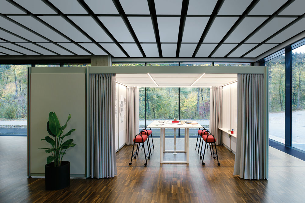 The design can be customised thanks to Bene’s range of “on- and infills”, which are available in various materials, textures and colours. By combining the modules with suitable lighting options, add-on elements and accessories, it’s easy to create the perfect ambience. Fabrics and curtains in a variety of textures and colours will lend the space a feeling of comfort, while melamine or veneer shelves provide structure to open rooms and offer practical storage space. The broad choice of designs can easily be adapted and expanded, and individual components can be exchanged; there is even the option of hanging opaque and acoustically effective curtains on the POINTS configuration.