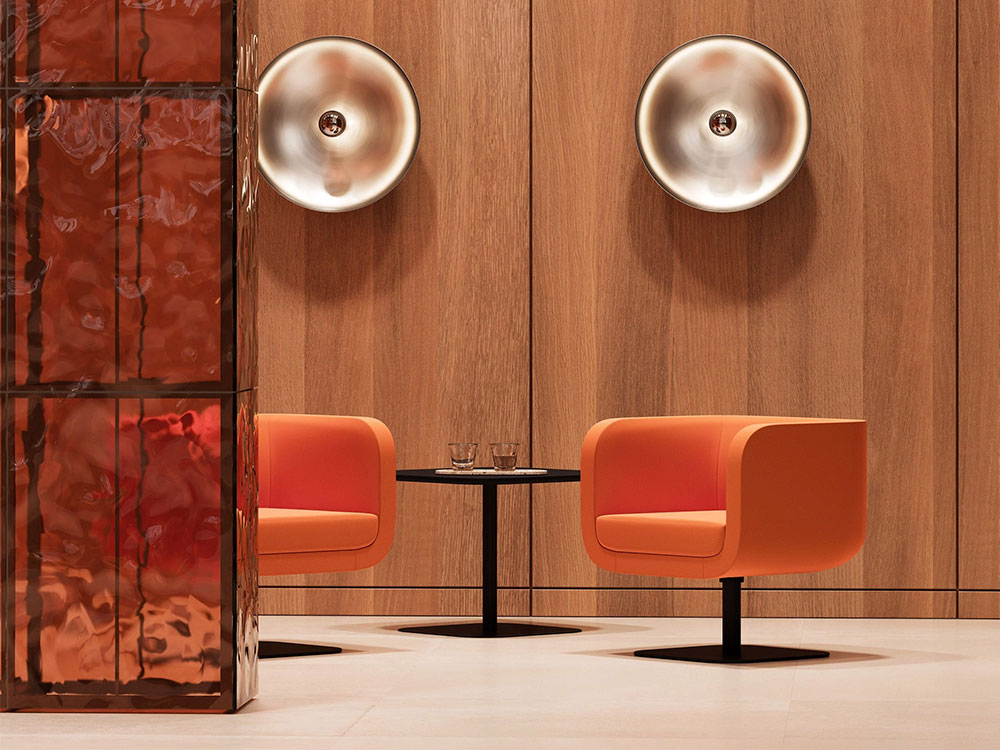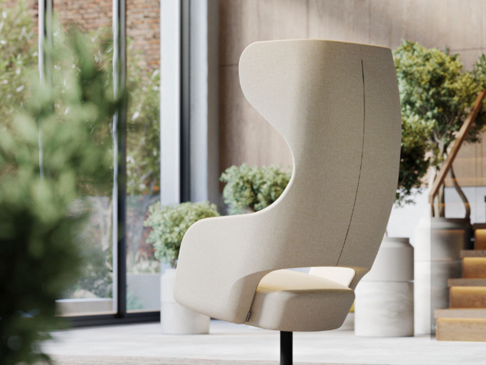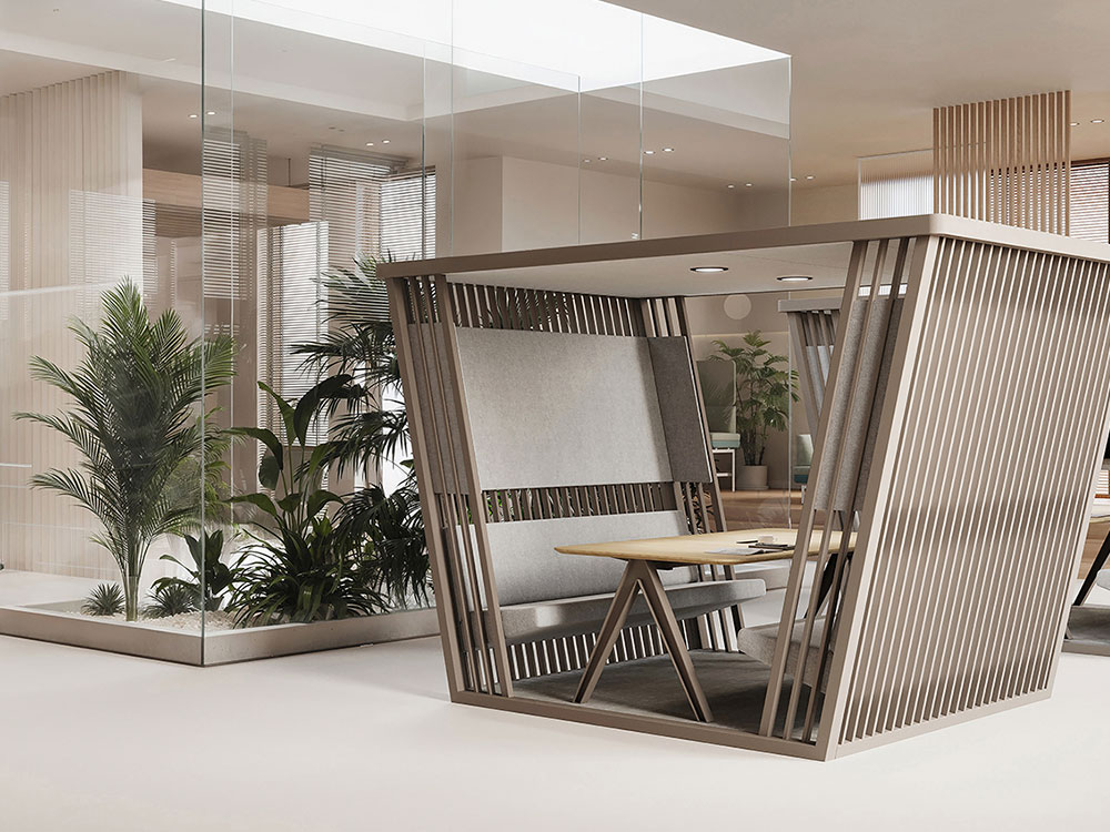 Kabanna introduces an ergonomic room-in-room solution for open plan office spaces. Produced for both virtual and in-person meetings, the angular design is not only visually appealing but has a semi-transparent materiality thanks to narrowly spaced timber slats, providing a sense of privacy whilst maintaining openness. The upholstered hood improves the acoustics of workplaces with high ceilings and ensure that conversations remain discreet and natural sounding.