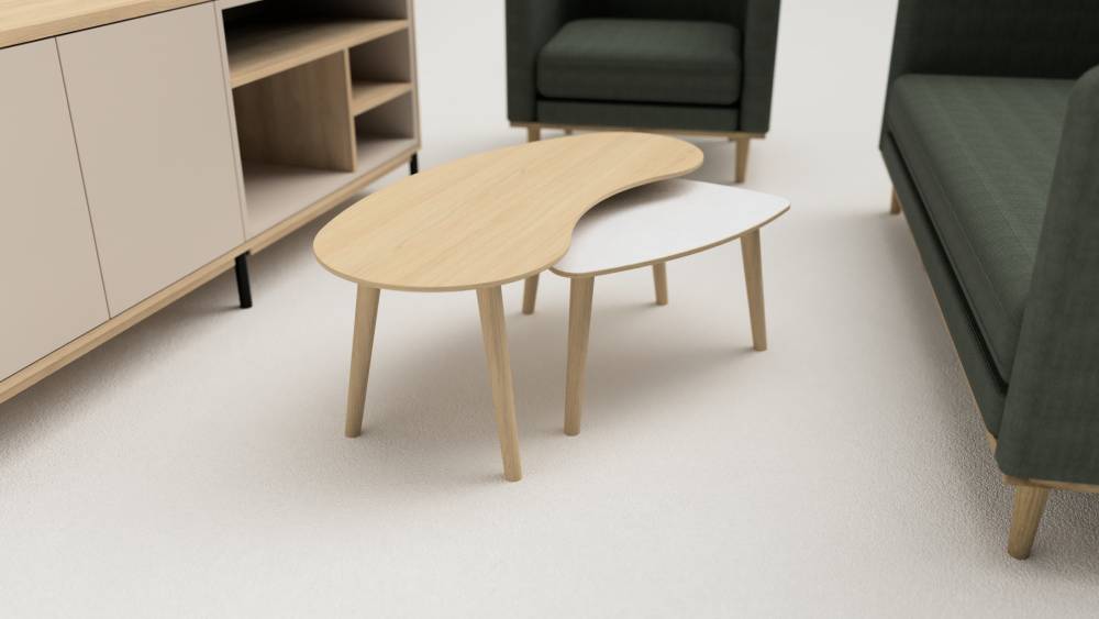 Rezign® veneer is made of textile waste, such as old denim, army clothing, suits and white denim. The sustainable veneer is also comprised of biobased fibres such as flax, hemp and jute coffee bags, with the fibres first shredded into small pieces and then carded into felt. Featured here is a nest of coffee tables where the smaller of the two tables features a White Denim Rezign® veneer, which works beautifully alongside the larger Oak and Oak veneer table.