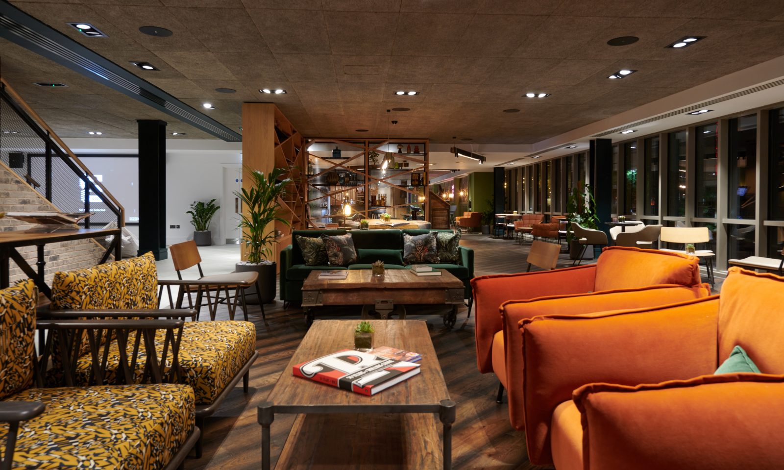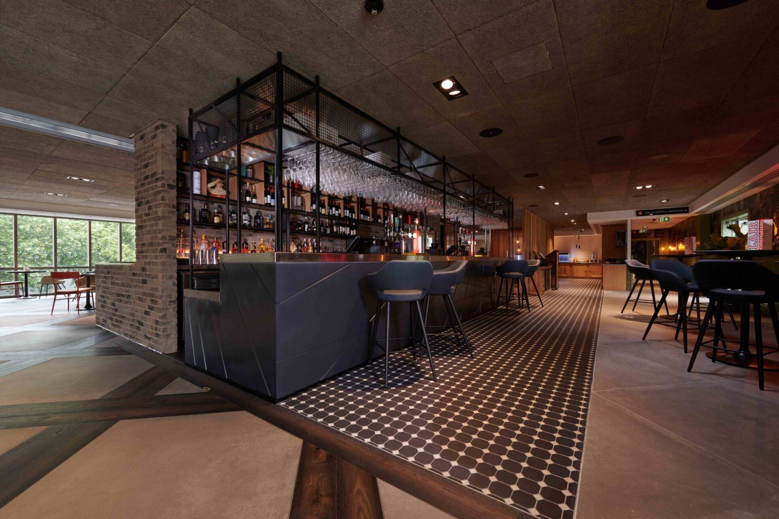 The combined bar, restaurant and socialising area is called the Lair – open to guests and the wider Leicester community. At the centre of this open-plan environment, the bar’s front facade is crafted from HIMACS Dark Night and features routed diagonal lines representing the patterns formed by the steel suspension cables of the Brooklyn Bridge. Part of the Solids Collection from HIMACS, the same surface material was also chosen for the hotel’s reception area countertops.