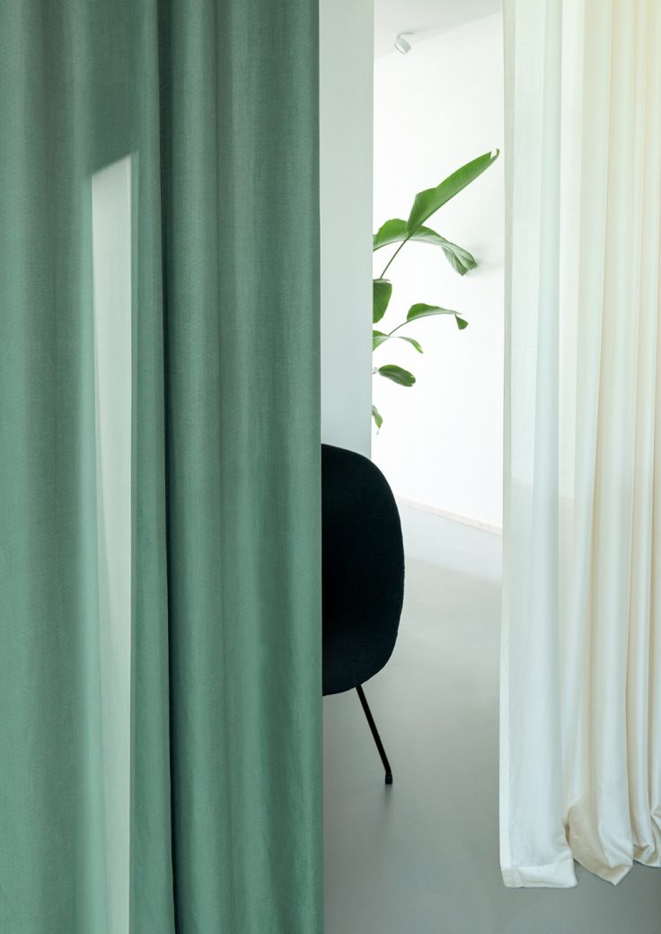 Yarns were exclusively developed for Monotypes, ranging from high-torsion to twisted moulinées and alternating slub yarns, highlighting the specific material and drape properties. Dyed and non-dyed yarns combine to express lively and natural notes.