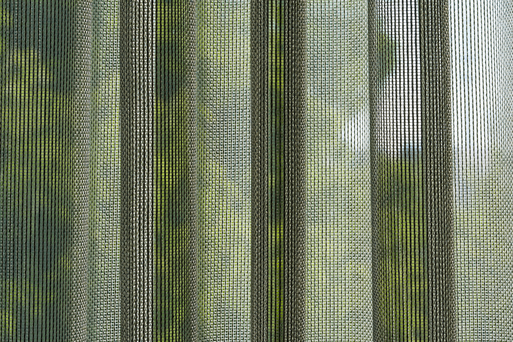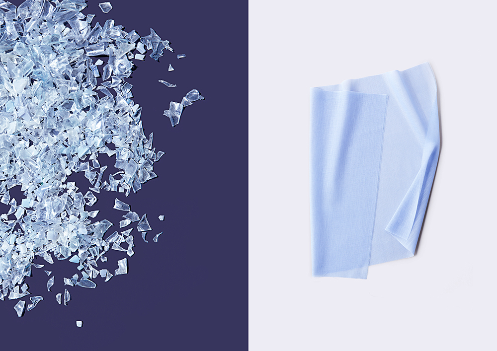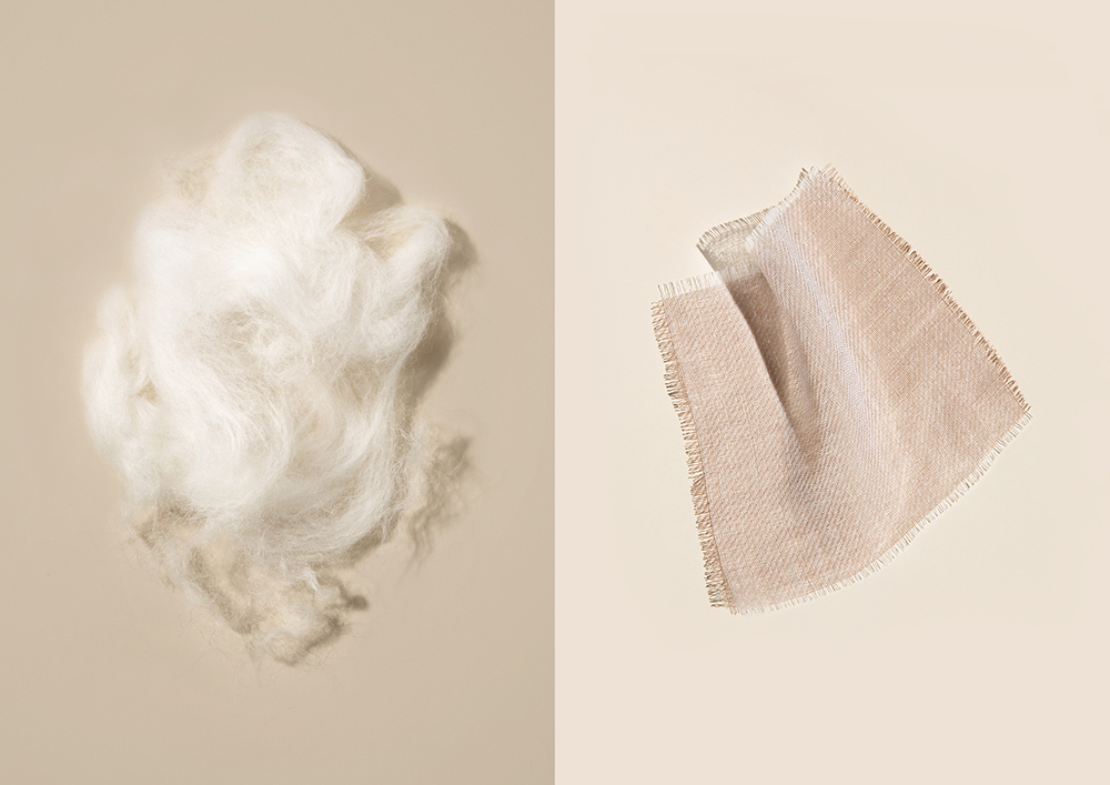 Precise weaving constructions reflect the individual essence and cellular architecture of each mono-material. A woollen sable with natural mélange yarns mirrors how wool looks under a microscope, while a graphic, net-like leno weave references the rhythmic manufacturing of recycled polyester.