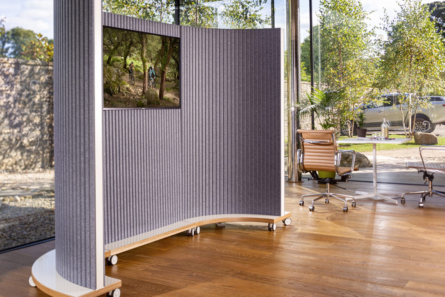 The latest in the ThinkingWall range of multi-function freestanding walls on wheels is the ThinkingWall Mobile Acoustic AV – now with battery power.