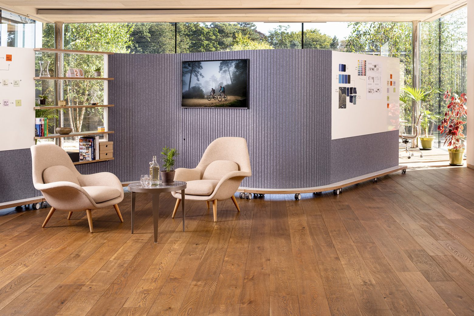 “There is a real desire currently for flexible, adaptable furniture solutions that are quick and easy to move around by teams themselves. This includes options that are powered, whether it’s a charging station that can move to where people are seated or something larger like a digital screen. One of the common challenges for teams is how to bring together those who are office based and those who are working elsewhere, and how to create collaboration zones that encourage interaction but maintain privacy. The ThinkingWall mobile acoustic range provides solutions to both problems as the units create a temporary wall, deliver acoustic privacy, and offer a digital connection to remote team members.”