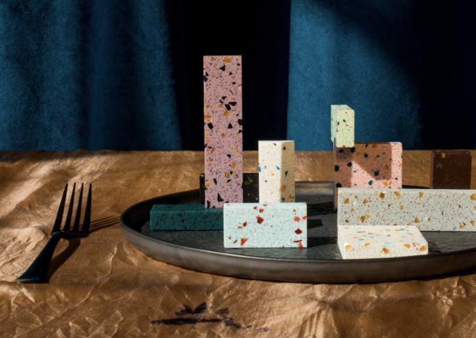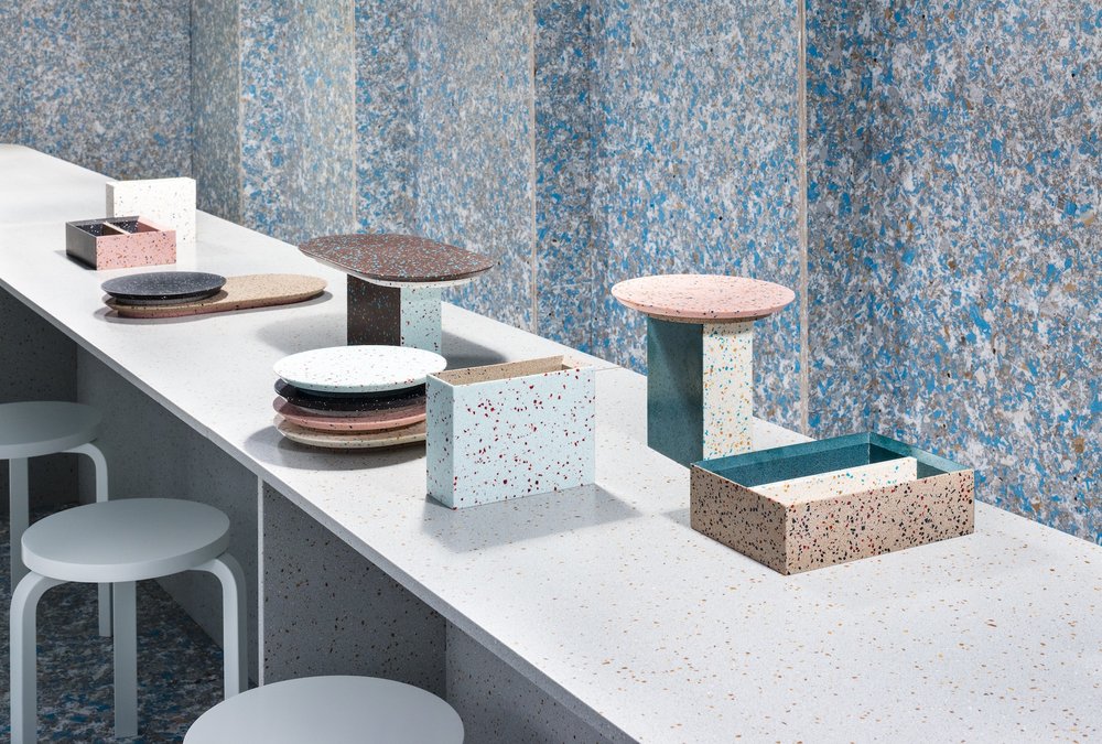 Durat uses post-industrial plastic waste collected from manufacturing and waste management companies in Sweden and Finland – the recycled flecks give the material its distinctive terrazzo appearance and allow Durat to reclaim all of its waste from production so it can be reused in other sheets. At the end of its life, the material can be refinished and repurposed in a new application or returned to be recycled.