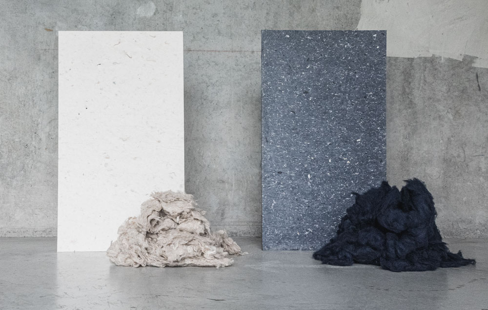 Created by designers Premices and co to address the challenges of the circular economy and using waste as a resource, Pierreplume is an acoustic material made from 70% recycled textiles like polyester, cotton, wool and acrylic, producing lightweight panels with the look of natural stone thanks to the subtle variation in recycled fibres.