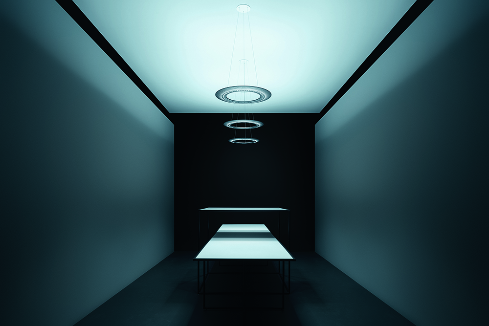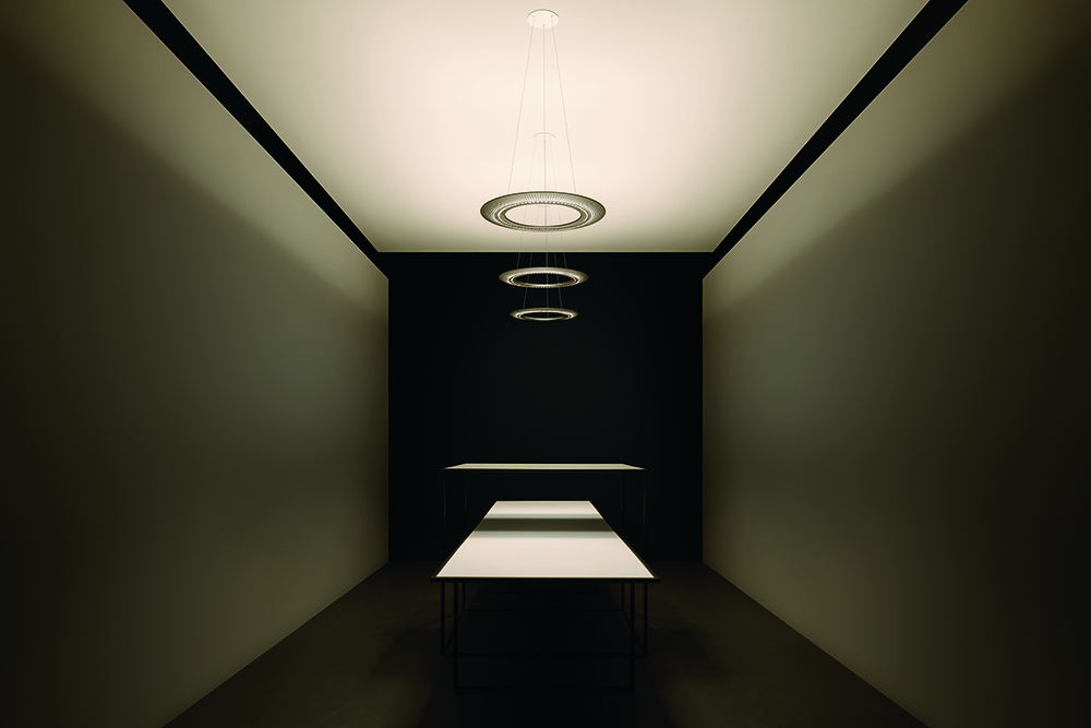 ‘It seemed to me a paradox to design a luminaire with straight lines when all natural sources of light such as the sun and moon are spherical,’ Yorgo explains. ‘Linear lighting systems often express disruption in a building that has complex geometry, rather than order. AMBITUS resolves this challenge because a circle is derived from a point; it can change direction and follows a modulated form without being oriented incorrectly.’