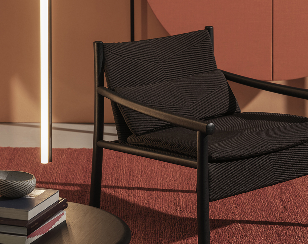 Sustainability in Kata was not an afterthought for Arper and Altherr Désile Park, but rather a core impetus for the design itself: an oak and black locust FSC certified wooden frame supports a tailor-made 3D knit textile, created from recycled polyester made from post-consumer plastic that is converted into durable and lightweight fibres. The knit technology is formed to fit the frame, avoiding leftover material waste found in traditional manufacturing.
