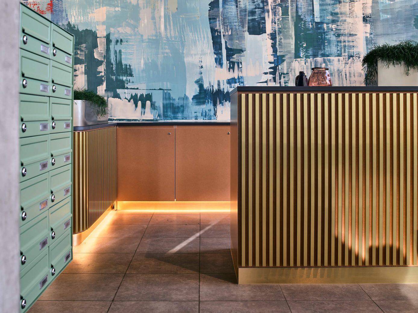 The fresco uses a powerful palette of pale mint, sage, teals, forest green and rust orange. Pigmented plaster was applied to sub-layers of wet lime-based plaster, before layers of colours were worked on with spatulas, and built up with spray and by hand, in a performative and expressive installation. In addition to this fresco, Aster Muro created a smaller fresco with a softer, more organic palette in the multi-purpose Gallery space to the rear of the ground floor amenities, overlooking the waterfront. Different aspects of sanctuary and reflection inspire both impressive frescoes.