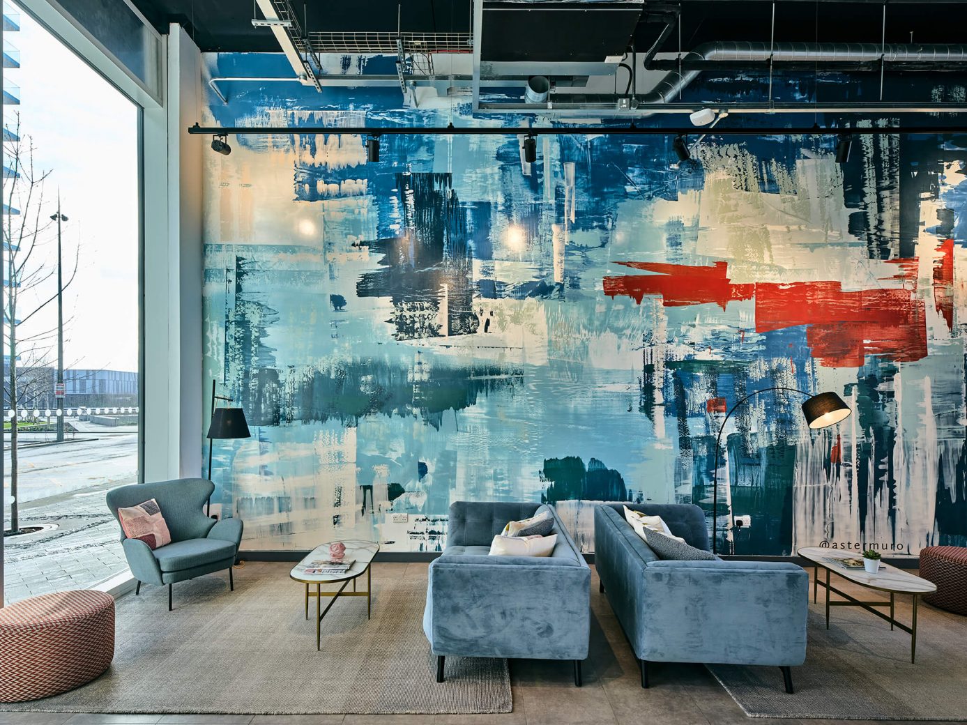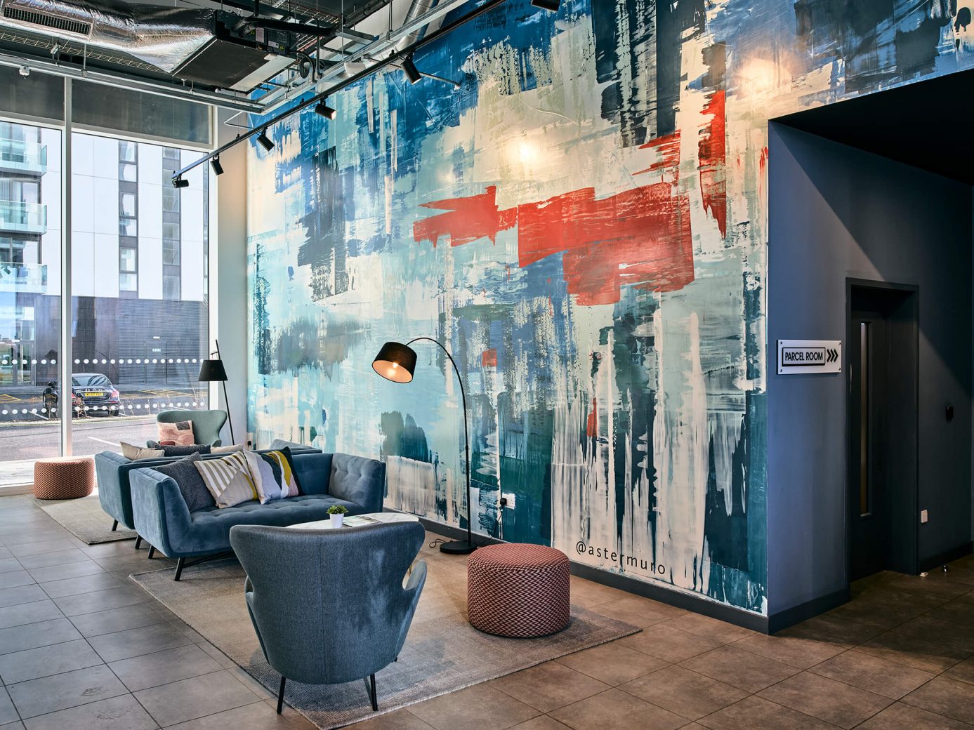 A strong feature of the lobby is a 16m x 5m monumental mural across the entire rear wall of the space, created by art studio, Aster Muro, together with students from the Manchester School of Art (MSA). The mural is a unique element of the scheme and, because of the building’s vast glass frontage, effectively also a public piece of art that is visible to those walking past on their way into MediaCity and the BBC’s offices. The fresco was created by artist Charles Snell of Aster Muro in an intense five-day time period in June 2020, assisted by four foundation students from the MSA, who had completed a training placement at the Aster Muro studio in The Wye Valley earlier in the year.