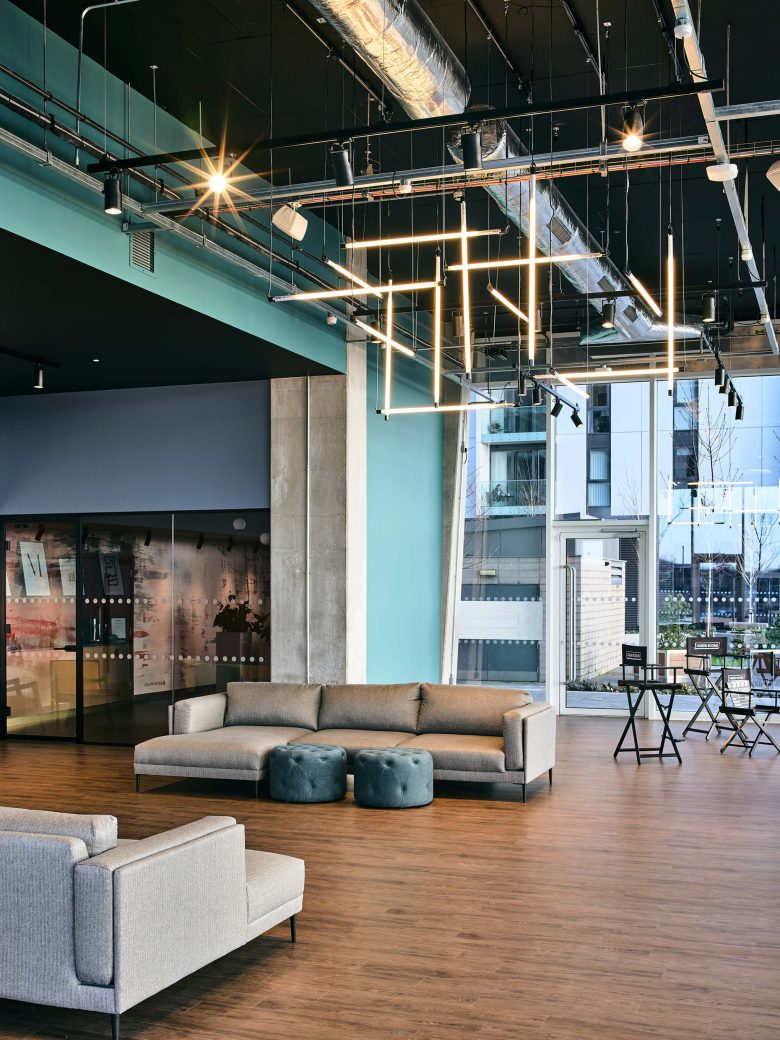 Towards the rear of the ground floor is the second set of amenity spaces, including a combined waiting area and public-facing lettings office for The Green Rooms. Although a more visibly landlord-run space, it was important to link the design of this area to the rest of the scheme, therefore it features rugs and throws, stylish storage, timber flooring and a strong joinery and lighting presence.