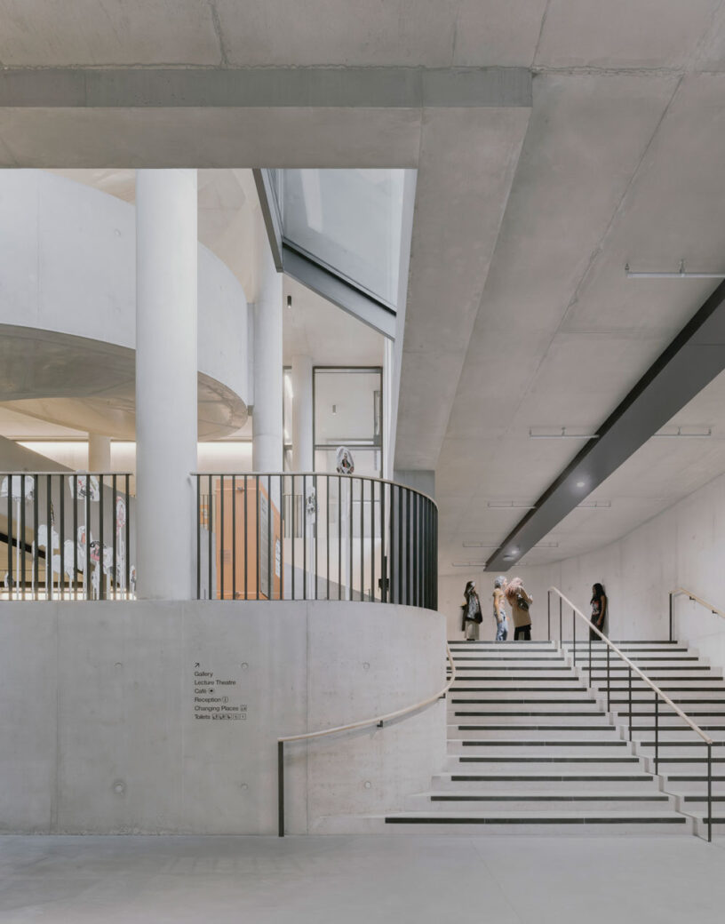 By layering a range of different configurations, Allies and Morrison created a singular, interconnected atrium that links the generous lower-level entrance hall and public spaces (namely, the auditorium, gallery, cafe and library) to the workshop and teaching floors at mid-level, and finally the refectory, drawings studios and roof terraces spread across the upper floors. Once dispersed across six different sites, these educational and social space are now connected in this atrium by a sweeping, sculptural staircase, punctuated with openings that allow ventilation and natural light to flood in – something also aided by tall, repeated windows evocative of a factory warehouse. An uncomplicated, muted palette of three materials – concrete, timber and black metal – continues throughout, purposefully allowing the creative, colourful output of the college students to take centre stage.