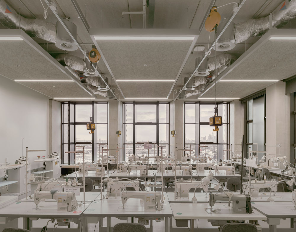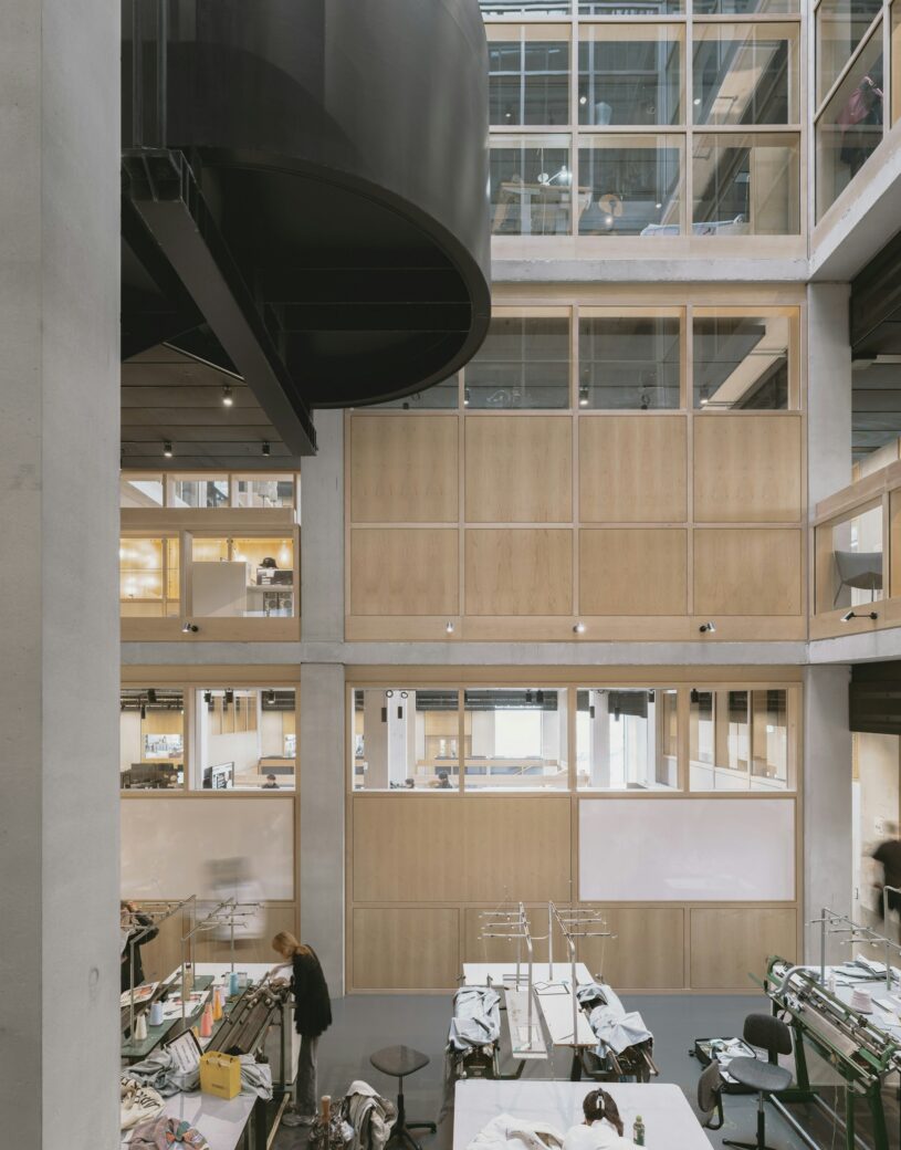 Despite providing a choice of non-specialised, flexible zones in response to the shifting nature of teaching and learning, specialist spaces with fixed machinery and appliances were also crucial to deliver the college’s practical courses. To determine this balance during the design stage, Allies and Morrison visited the six sites across London that were still hosting the college: Curtain Road, Golden Lane, Mare Street, John Prince’s Street, Lime Grove and High Holborn. Here, the architecture team took inspiration from these workshop spaces, both in terms of their atmosphere and functionality, and allowed this to inform the final concept for the new and improved London College of Fashion complex.