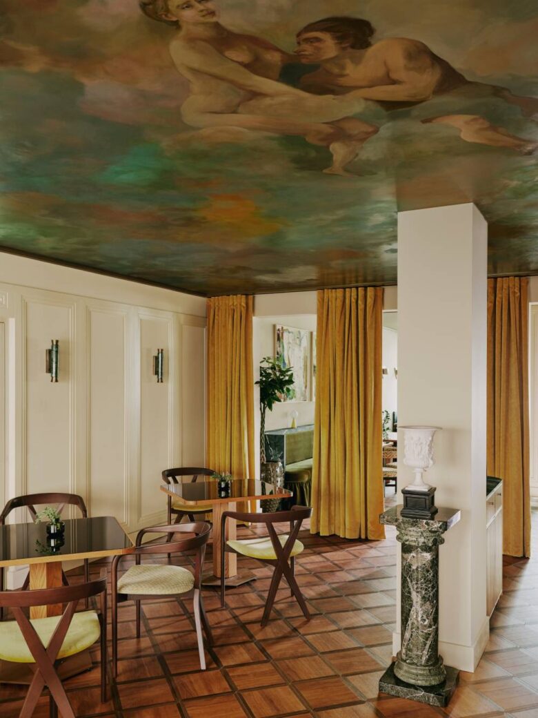 Alongside the decadent food and drink on offer, guests can sit back and enjoy the classic mural wallpaper spanning the ceiling of the restaurant, Villa Borsani-inspired rugs, and an array of Gio Ponti Bilia lamps that create a soft, ambient dining atmosphere.