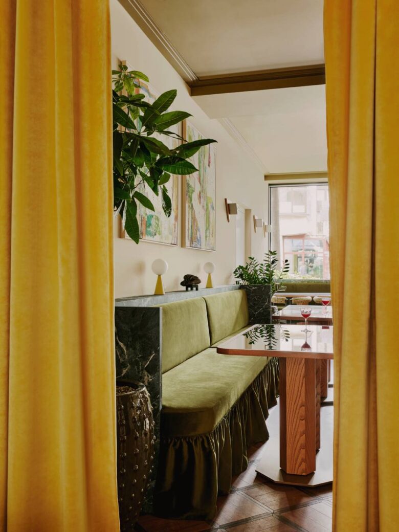 Bespoke furniture pieces designed by Parla and Sella line the windows of the lounge and restaurant spaces, and terracotta, green and yellow velvet finishes by Yarn Collective mix with stainless steel, microcement and high gloss paints to create a vibrant, textured space. To maximise multifunctionality, Locke am Platz’s lounge and restaurant are built for seamless day-to-night transitions with a DJ booth that doubles as a high table for daytime guests.