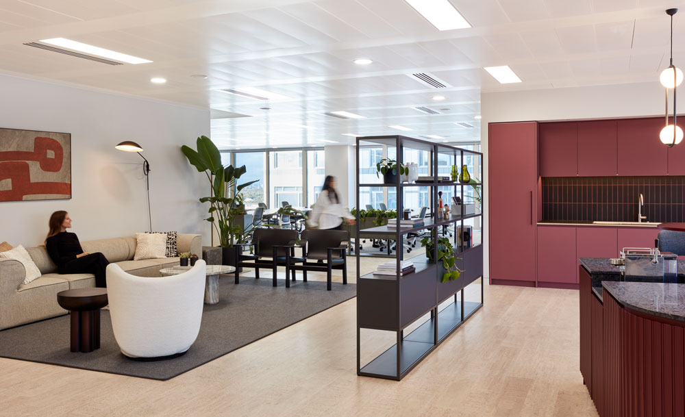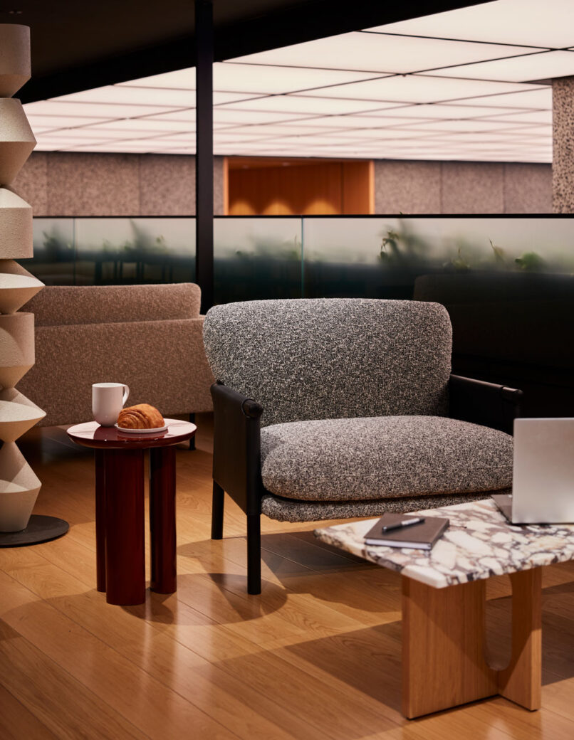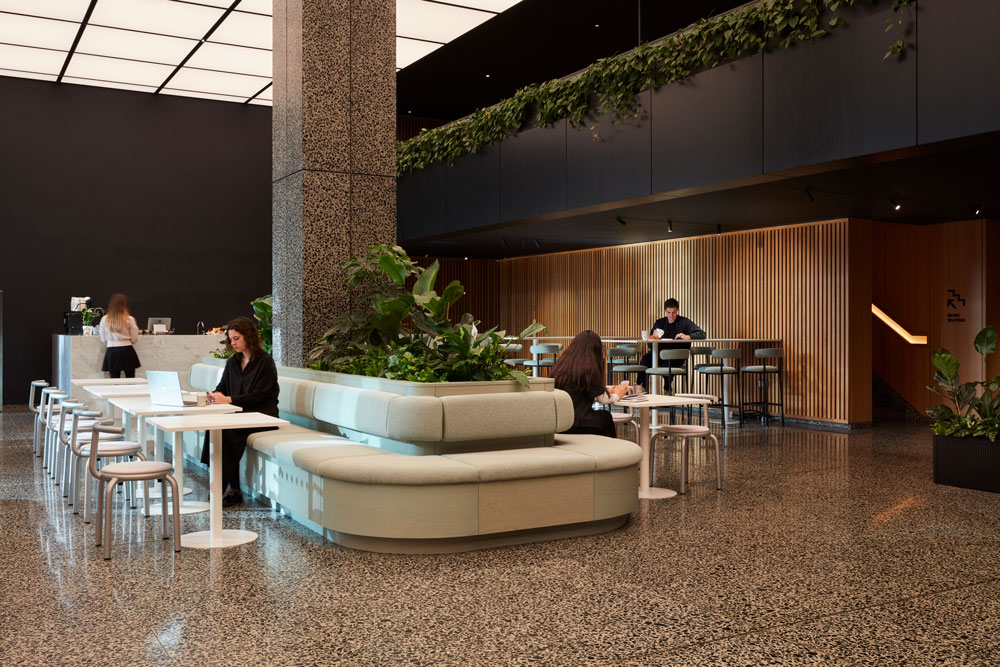 Downstairs, the refurbishment has updated the lobby with a cohesive architectural blend of contemporary terrazzo floor, oak timber and striking illuminated ceiling – which the team describes as reminiscent of the Mies van de Rohe TD Centre in Toronto. Retaining these elements within the new design, Basha-Franklin has overhauled the 558 m2 office lobby and mezzanine level, with cleverly collaborative co-working spaces and a hotel-centric aesthetic for an elevated experience and an “enhanced sense of place.”