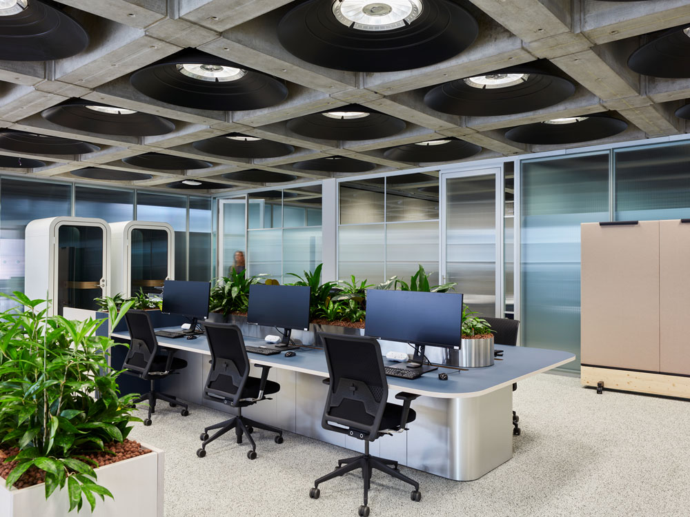 In contrast to the rest of the floor, the south side has more natural light and outdoor views, now a focus area for up to 50 team members. The finishes in this space are natural, light and fresh, allowing the iconic concrete coffer to be celebrated as a foreground feature.