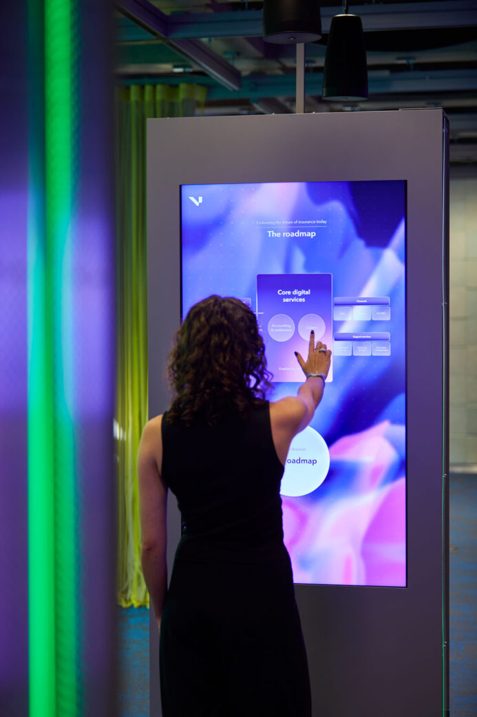 The northeast side of the floorplate has limited access to natural light, making it the ideal place for a hi-tech digital zone. Here stands an interactive exhibition space, which showcases the digital transformation that is revolutionising the insurance sector.