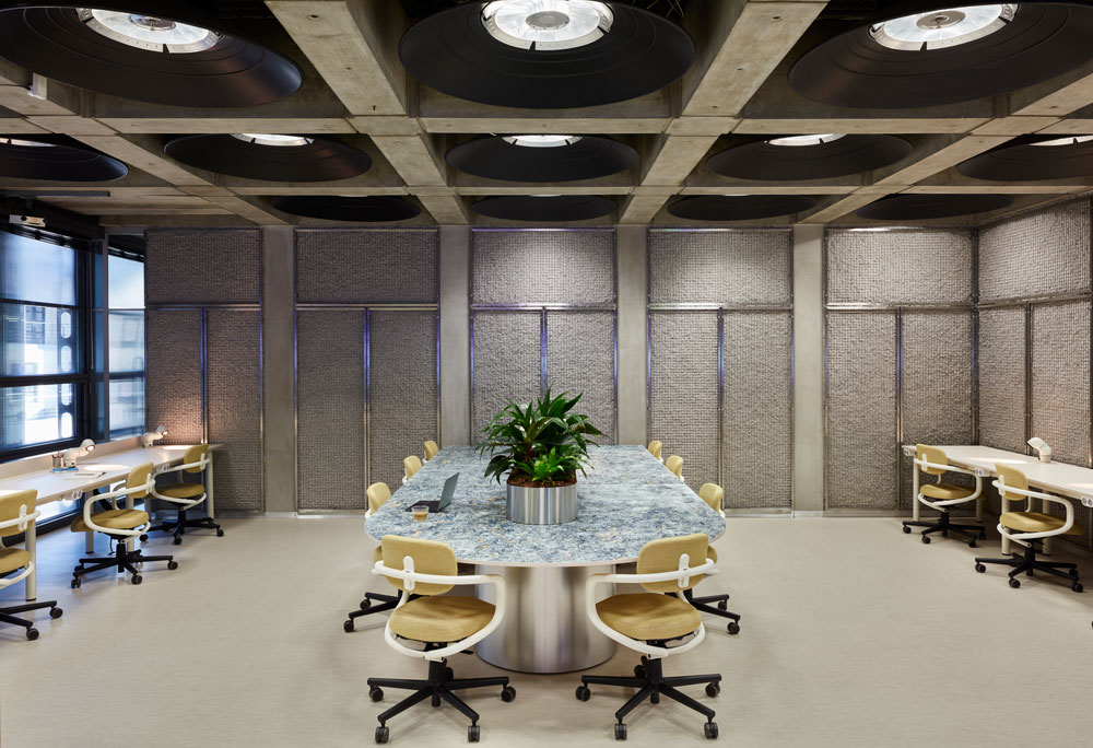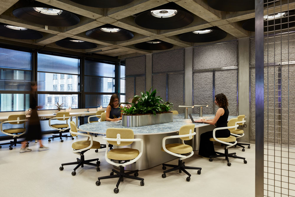 Given the iconic status and complexity of the building, it was important to design a space that not only celebrates the architecture, but maximises it, says Basha-Franklin’s Nicola Osborn. To protect the listed grid coffer ceiling and striking original light fittings, Basha-Franklin specified a bespoke Visplay multi-lane system, creating a secondary floating grid below the existing ceiling. “Traditionally used in retail environments, the secondary grid enables ultimate flexibility to reconfigure fittings and fixtures, including lighting, AV connectivity and power, allowing this futurist hub to break the prescribed building uniformity internally.”