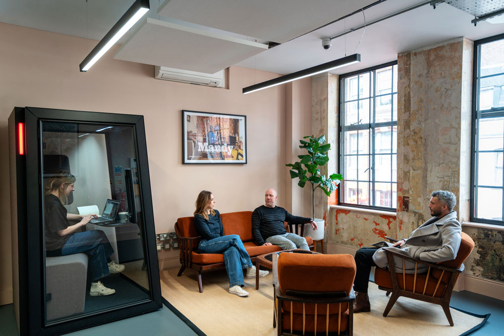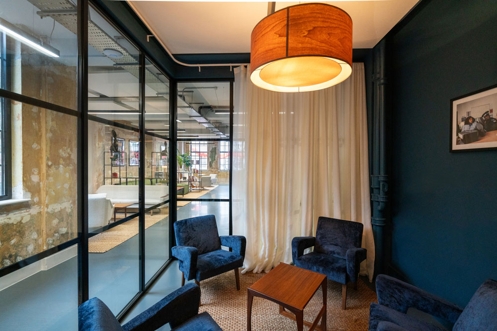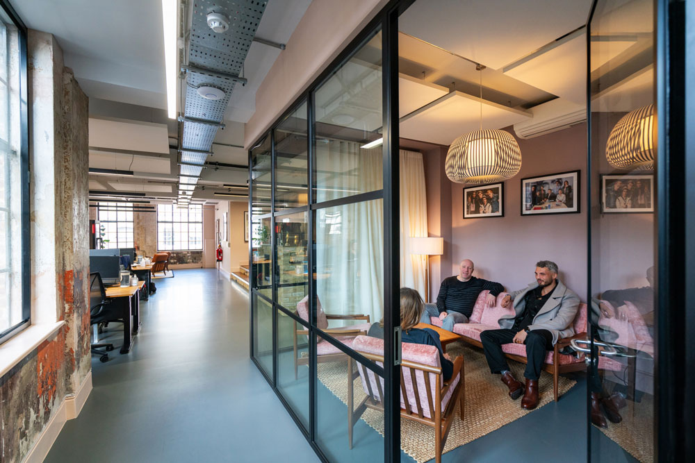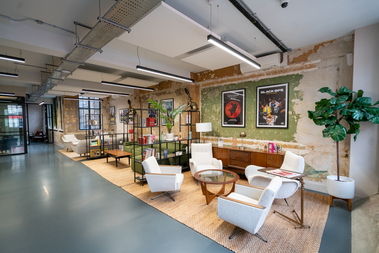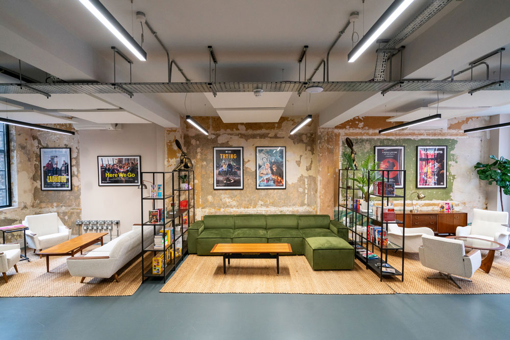 HOK fostered a feeling of home and familiarity by selecting vintage mid-century furniture, and balanced these with the raw, unfinished base-build walls that reveal the building’s storied history. However, much mid-century furniture does not meet today’s fire regulations, meaning that the HOK team had to be highly mindful when choosing certain pieces – often re-upholstering to ensure safe use. The second floors of both buildings focus primarily on desk-based work, while still offering an eclectic range of meeting spaces and focus booths, ensuring that the space is geared towards both work and socialising. These individualised spaces are further brought to life with an array of BBC Comedy artwork, memorabilia and awards, dating from the mid- to late-20th century.