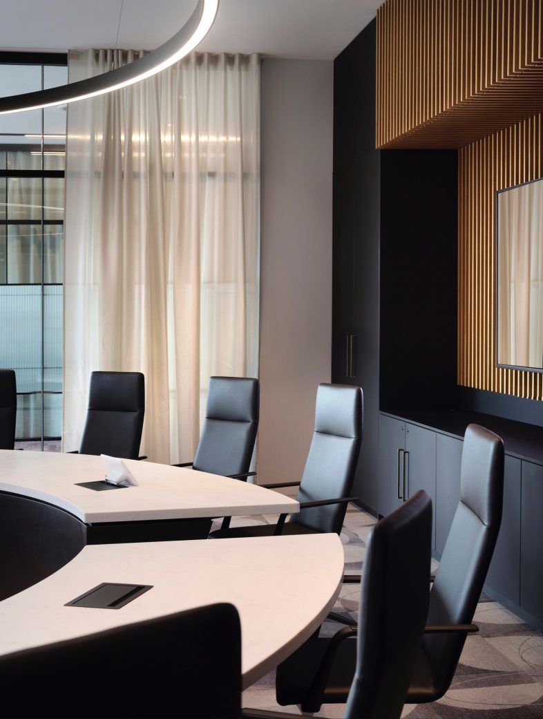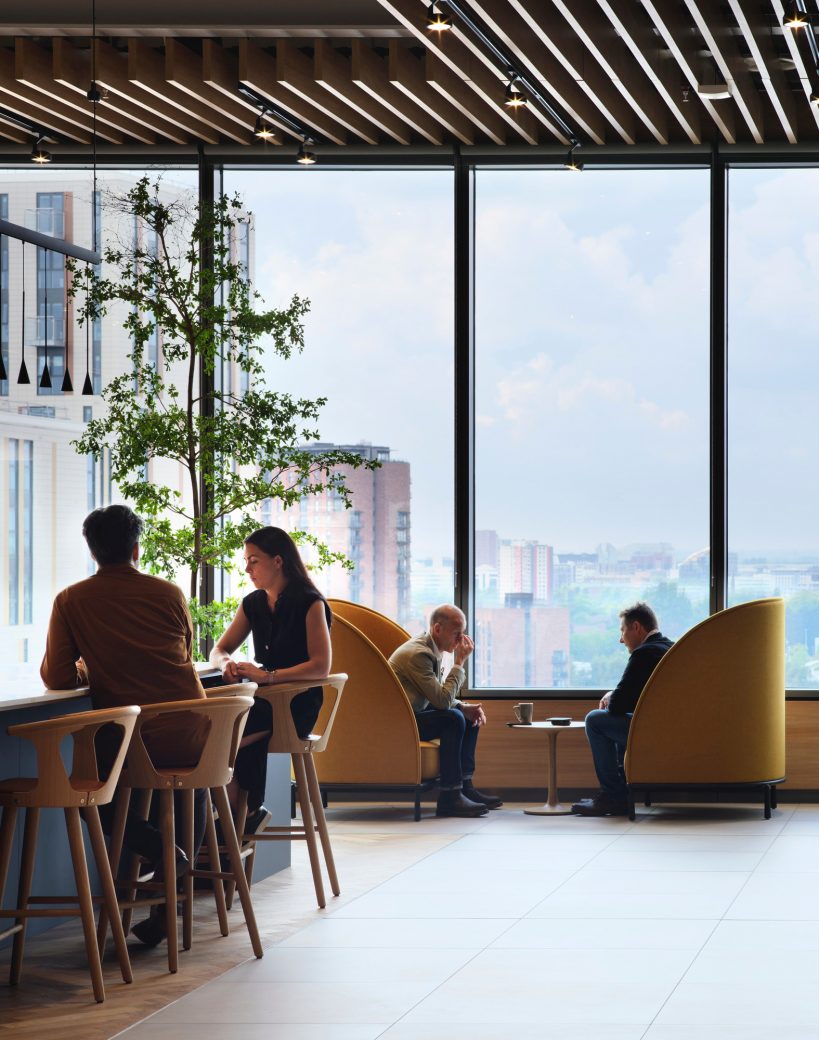 The design concept is corporate yet friendly and features elements from Manchester’s urban landscape and industrial heritage, with exposed ceilings, metals and neutral tones as a backdrop, incorporating the surrounding countryside with biophilic, natural materials such as timber to aid a sense of calm. The use of angular internal architecture to mimic the external façade is offset by softer, curved furniture and planting. Each meeting room uses this base design concept, while incorporating different elements such as lighting, furniture and flooring within each room to add interest. Extensive timber panelling, slatted ceilings and exposed soffit areas help define and give identity to different areas across the floors.