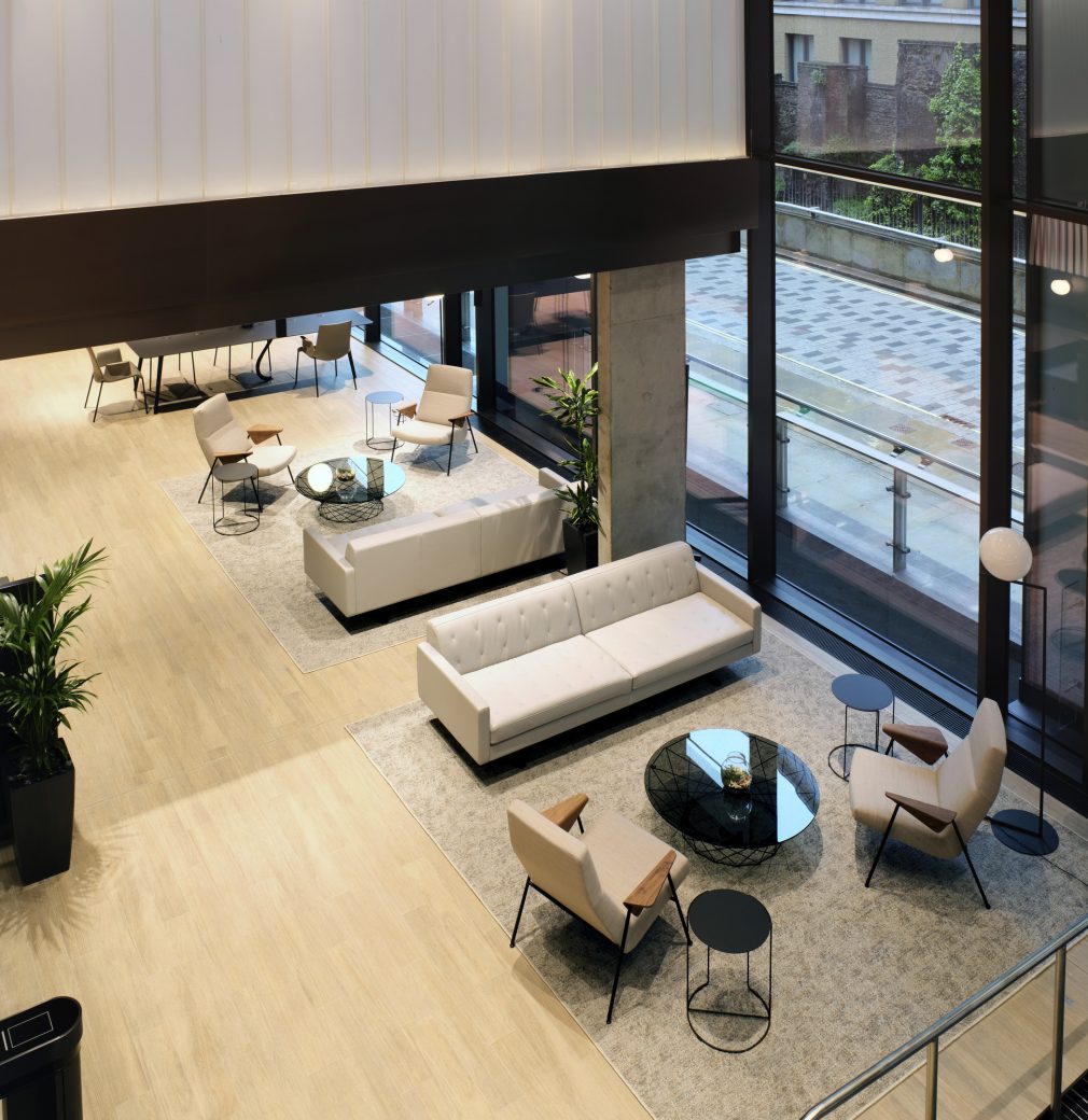 Now visible and welcoming from ground level, the team has introduced a canopy with portals that run from the main corner of the street and all the way around the building. The entrance space, once cramped, is now an impressive double-height reception space, expanded to include a lobby and self-serve café.