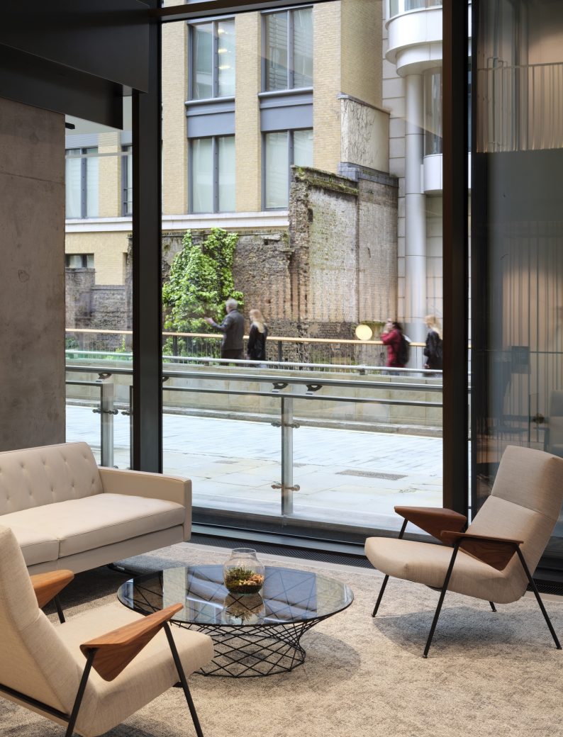 Materials take inspiration from the London wall and Roman-esque materials like concrete and timber, but with a distinctly contemporary and clean feel. Furniture is mid-century in style, with timeless designs from Carl Hansen and Knoll. Stained black and natural wood and ceramic timber-look flooring create a warm, cohesive feel from the reception into the lobby coworking spaces, with touches of texture from bare concrete panels and wooden partioning. A line of bronze metal runs through the space, sitting around the lifts, skirting and reception desk.